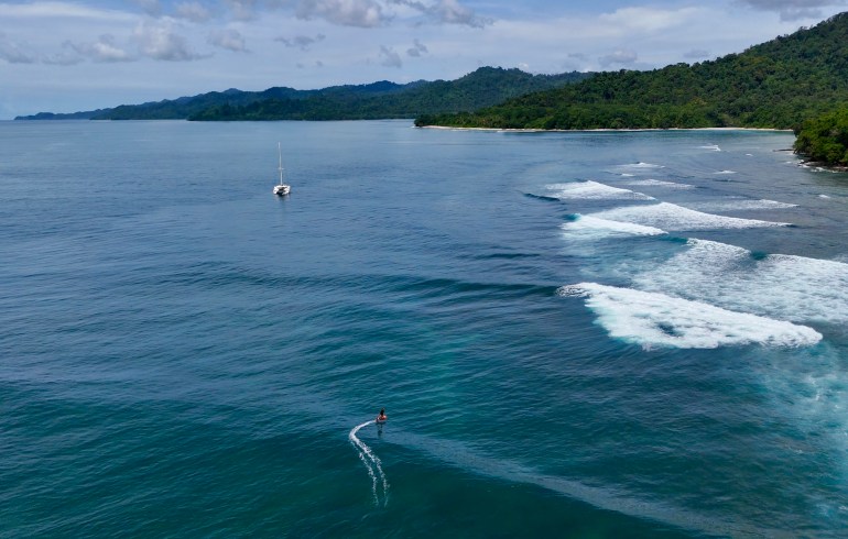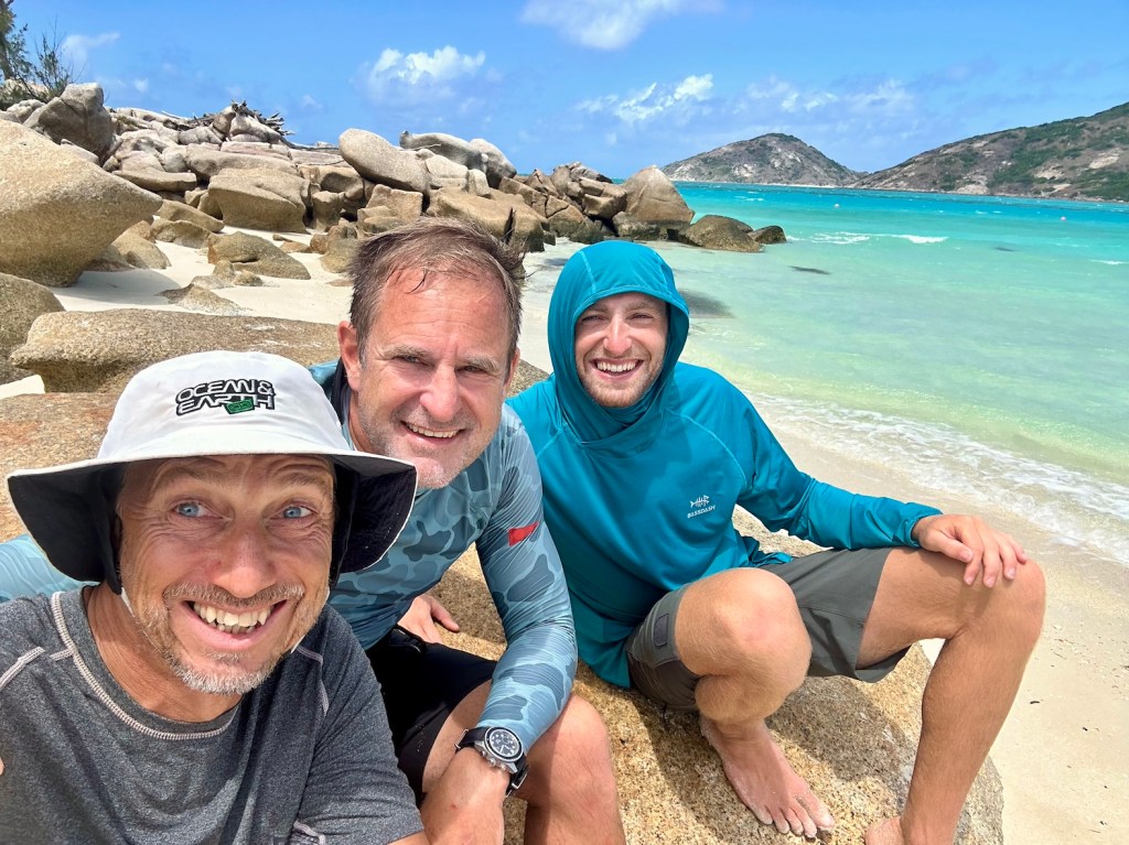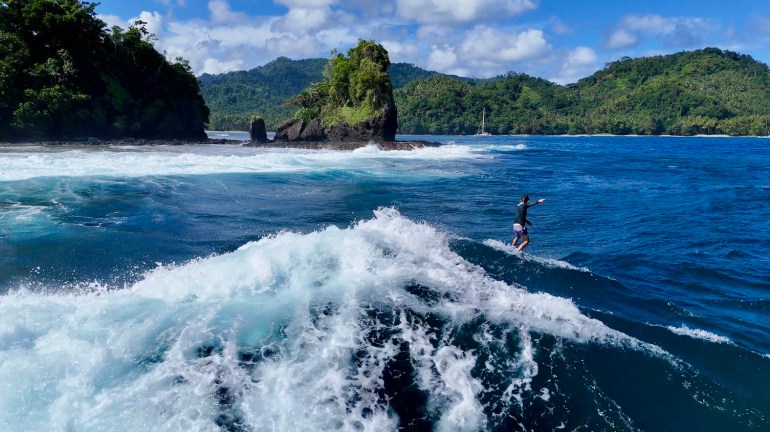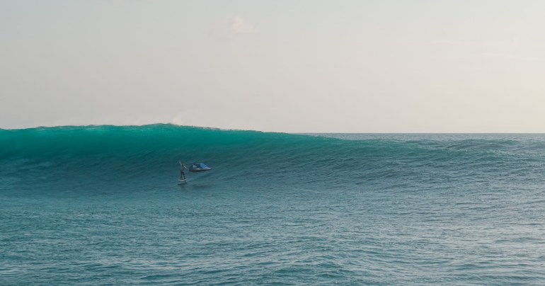 This is a very remote spot and the waves were much bigger than we had realised. I towed Bryan and Trent into some clean lines, with Jack piloting his drone from Escapade and calling sets to my handheld VHF. The boys courageously dropped the tow rope and sped off into unknown territory.