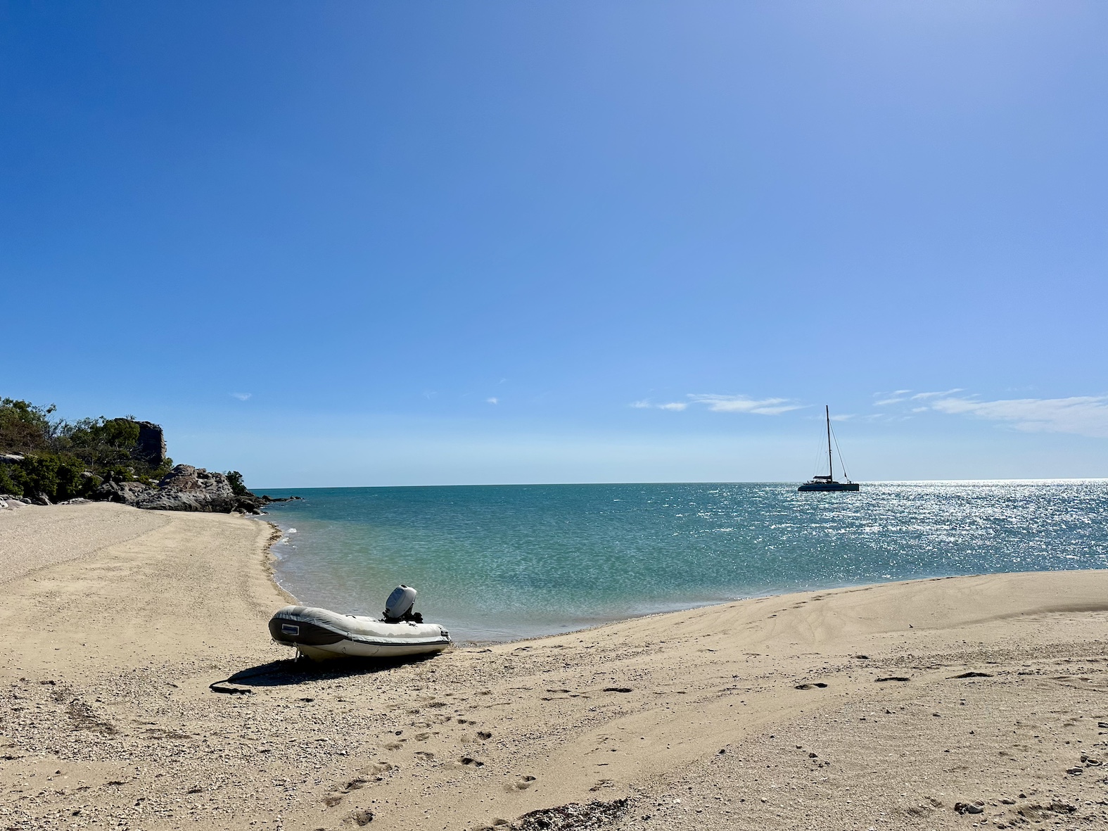 Just the four of us, scanning the horizon, watching the sets arrive. Endless waves. Escapade is a 10 minute paddle away, swinging at anchor in the huge empty bay. Forest covered hills, white sand beaches. No wind yet, still no other humans in sight. These really are the moments. The ones when the whole Escapade project makes sense.