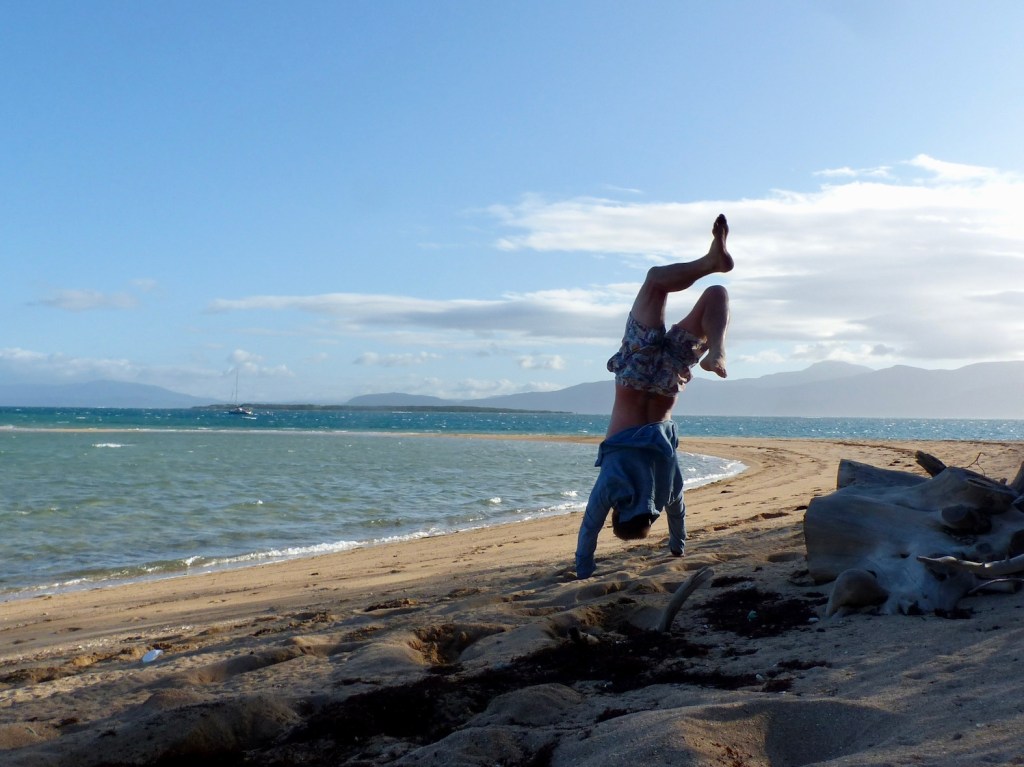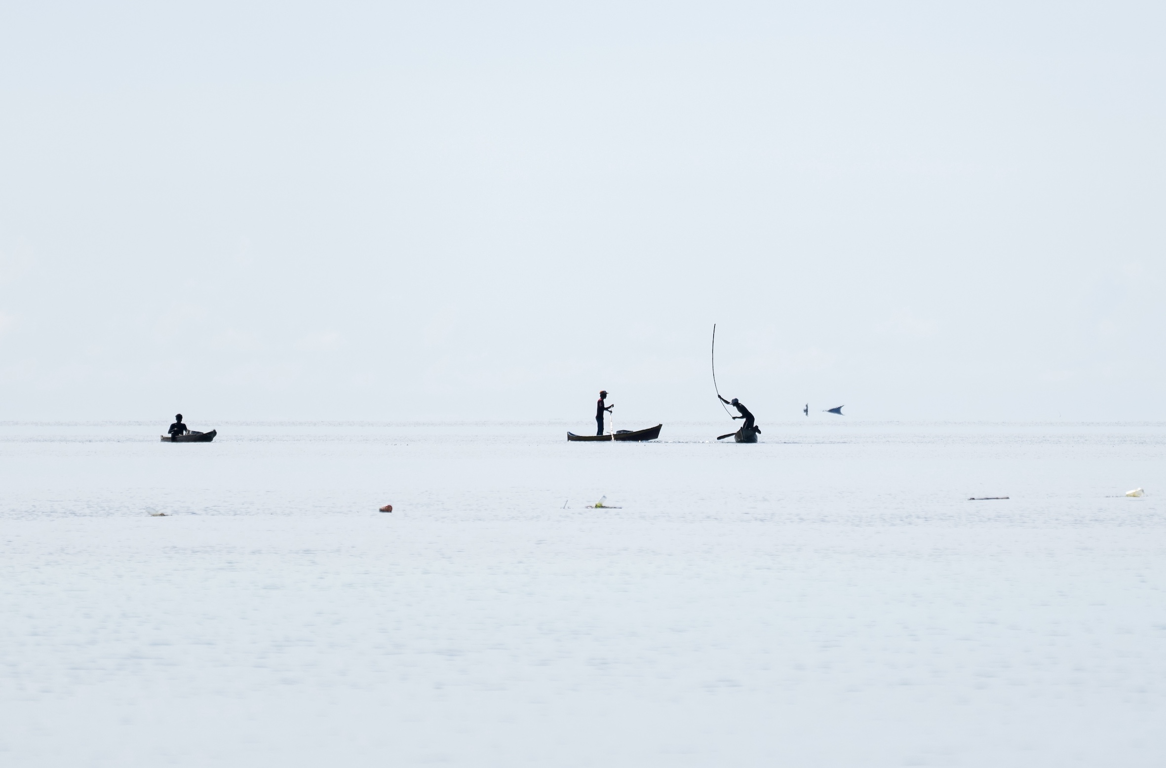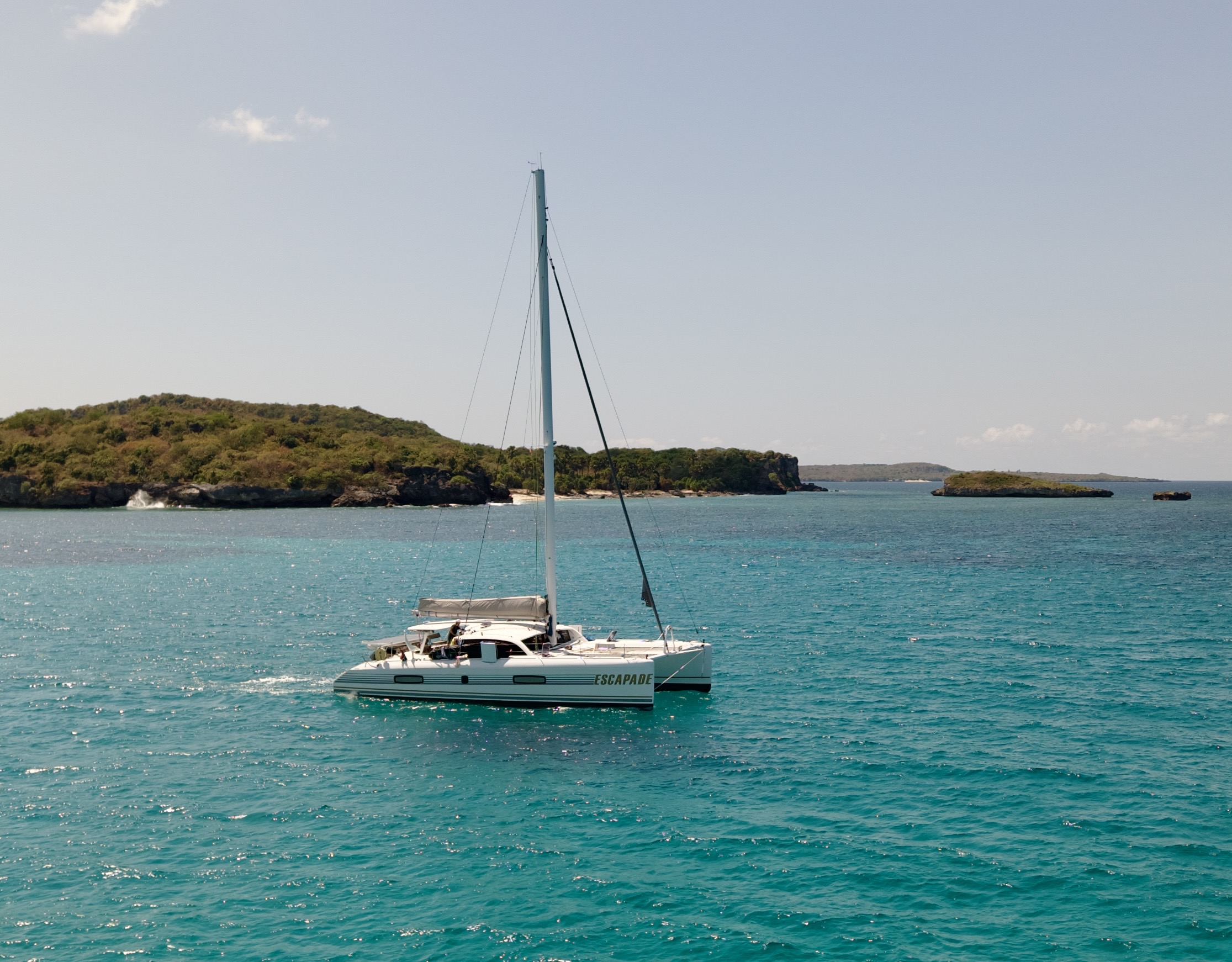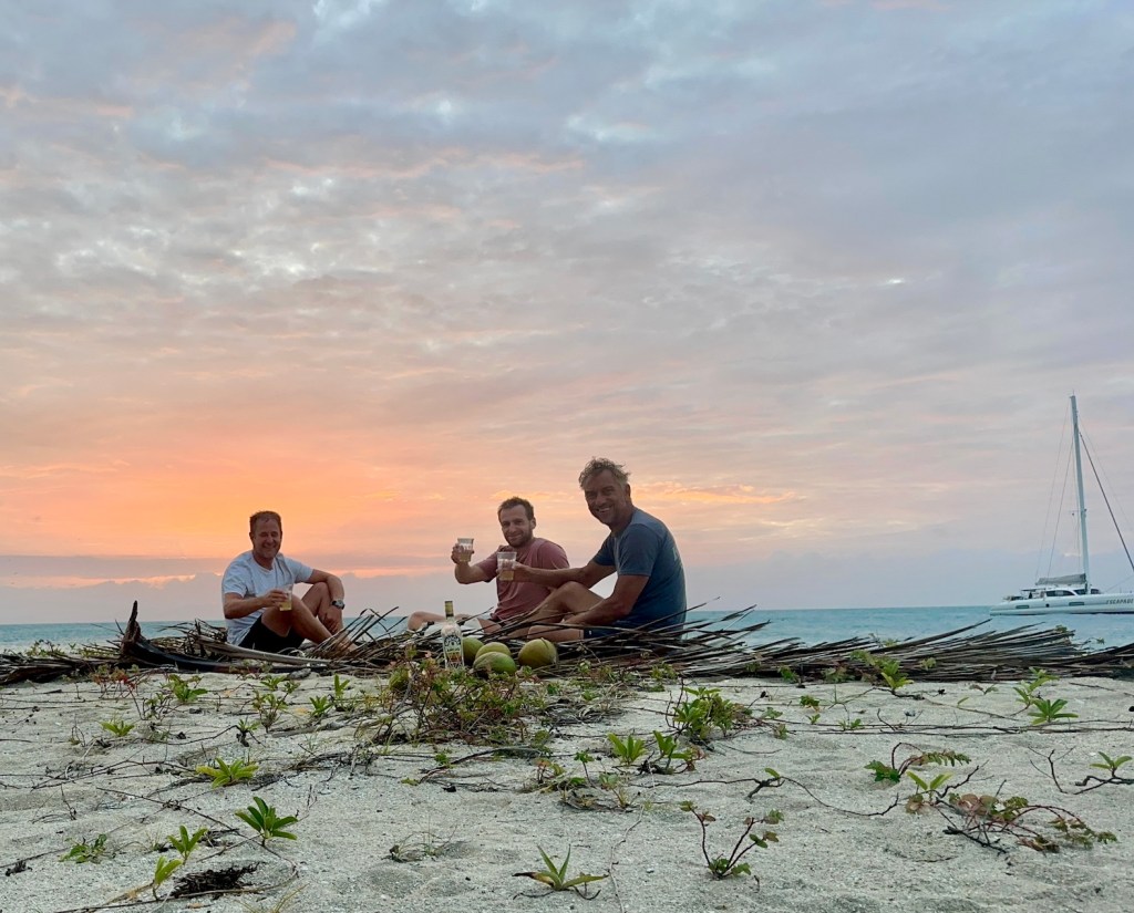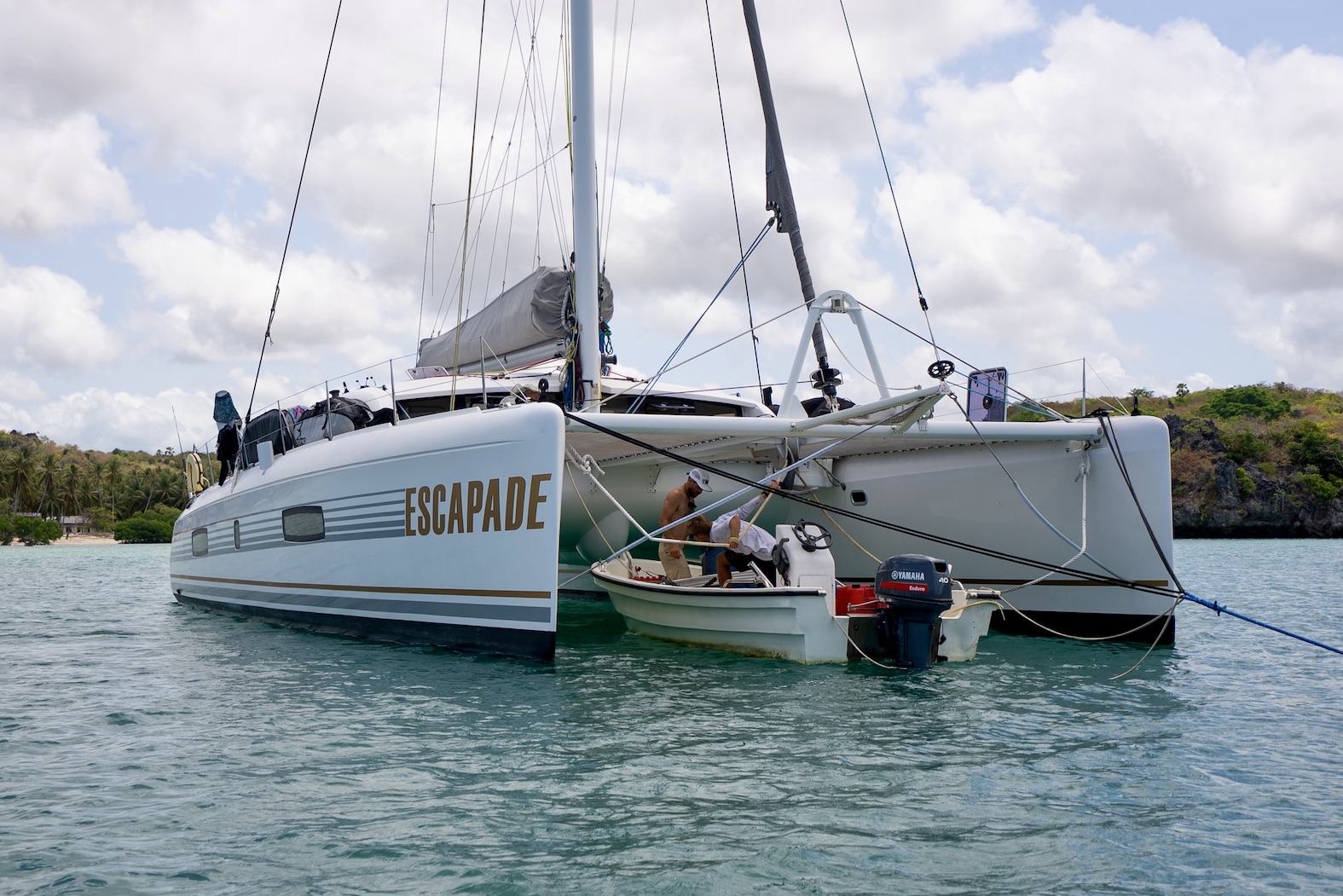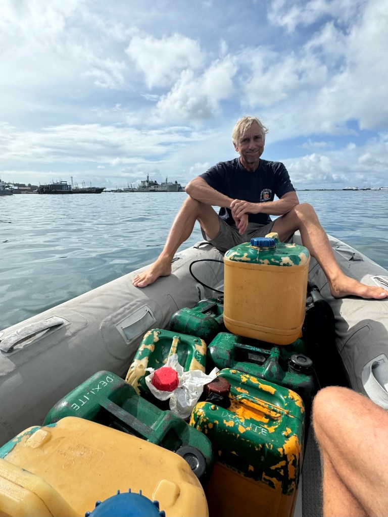 In a land with no fuel docks, we innovated a bulk diesel delivery using half a windsurf mast to carry a 200 litre drum down the beach. It was manhandled on to a borrowed boat, which was positioned under our trampolines, then fuel was pumped from the drum, through a filter and up into Escapade’s tanks.