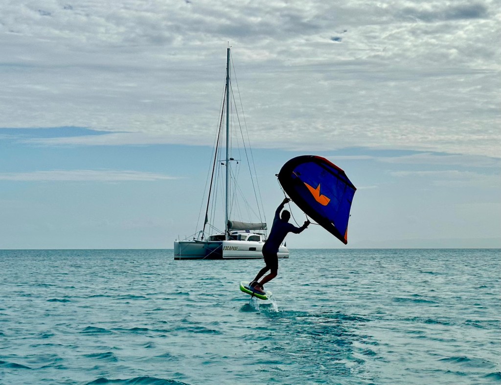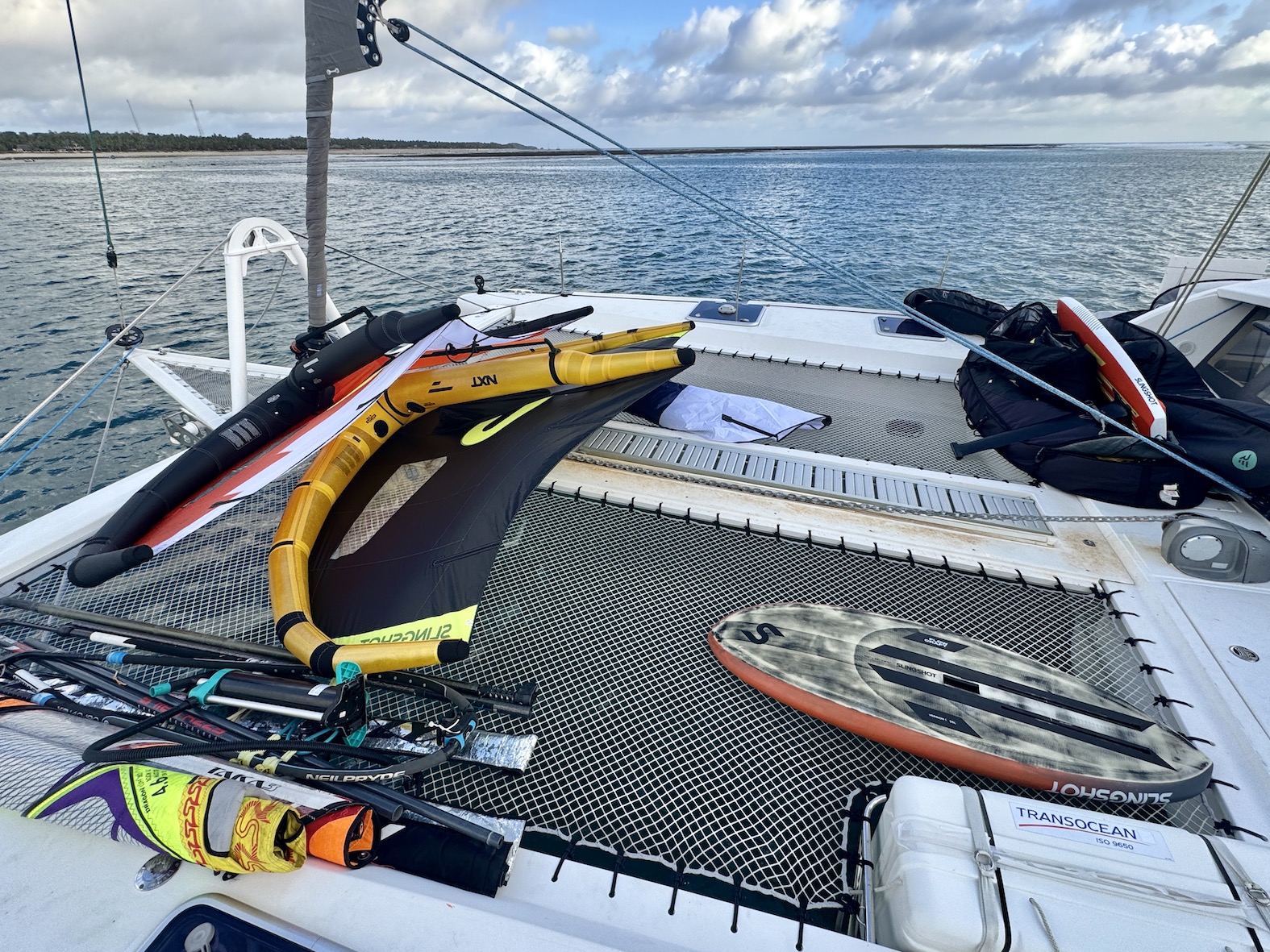 Convinced, we re-anchored Escapade and pumped up some big wings. Trent and I went off to ride the biggest waves I have ever tried to wing on. Very grateful to have Bryan in the dinghy on safety patrol for that session.