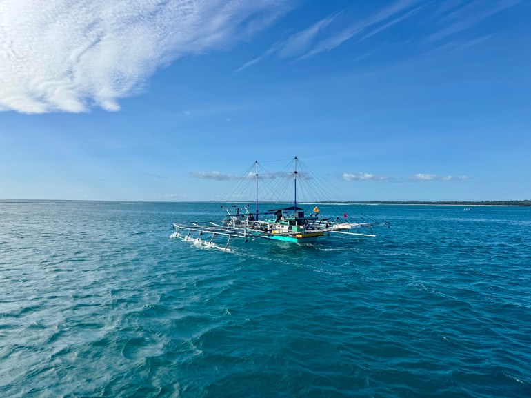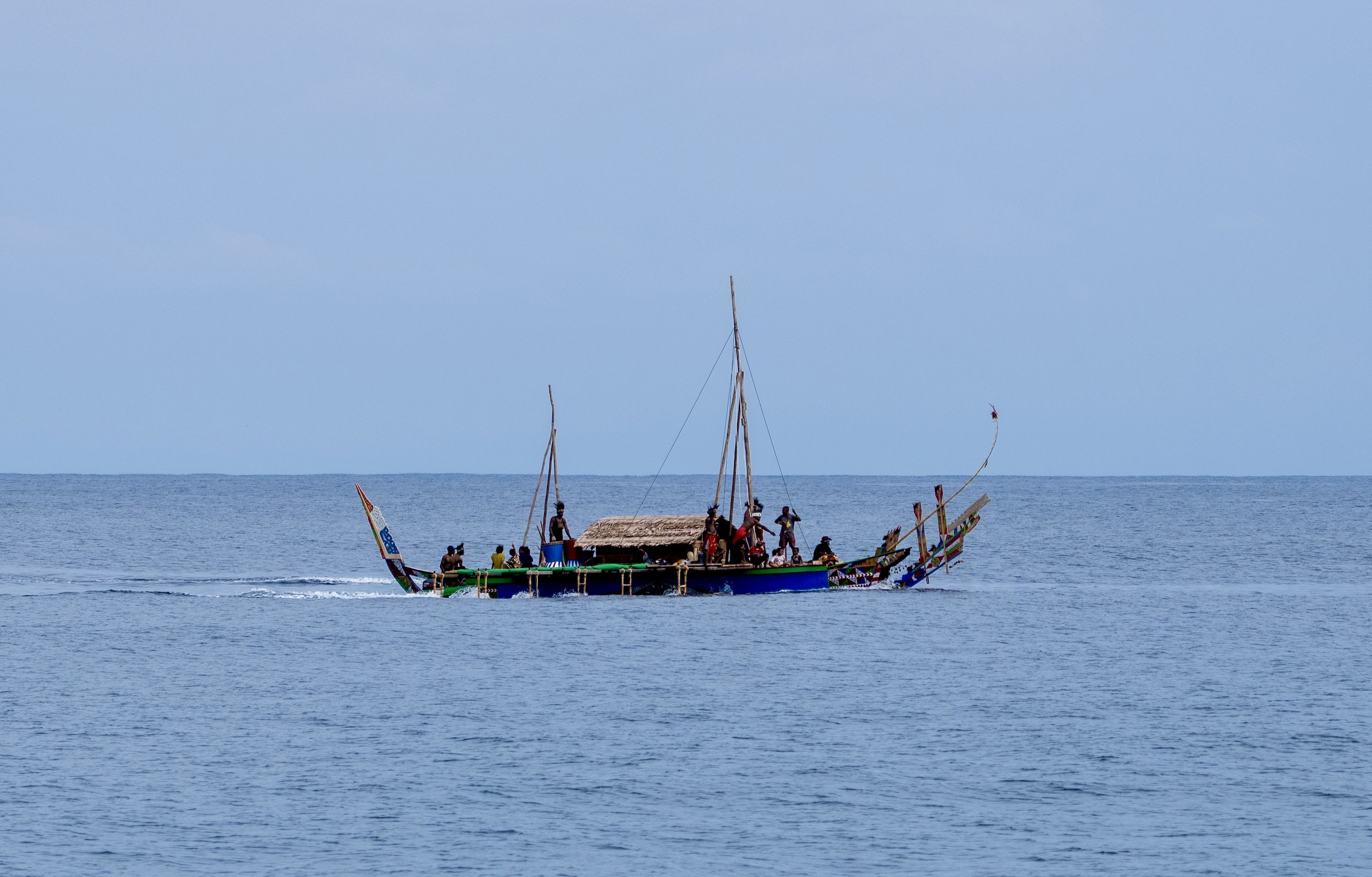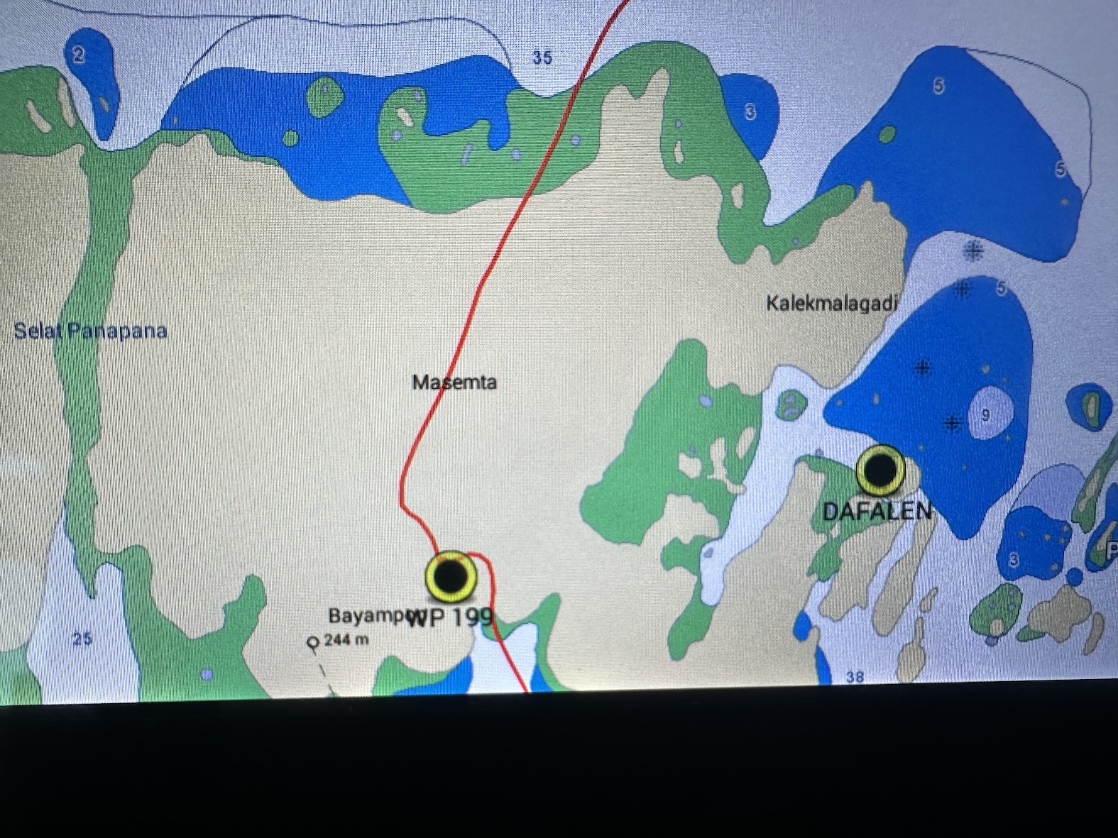 A full moon and big tide allowed us to leave the protected lagoon at Oeseli, out through the narrow pass between the reefs, fish-traps and seaweed farms.