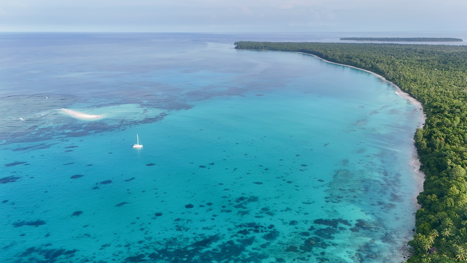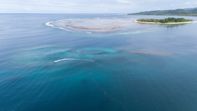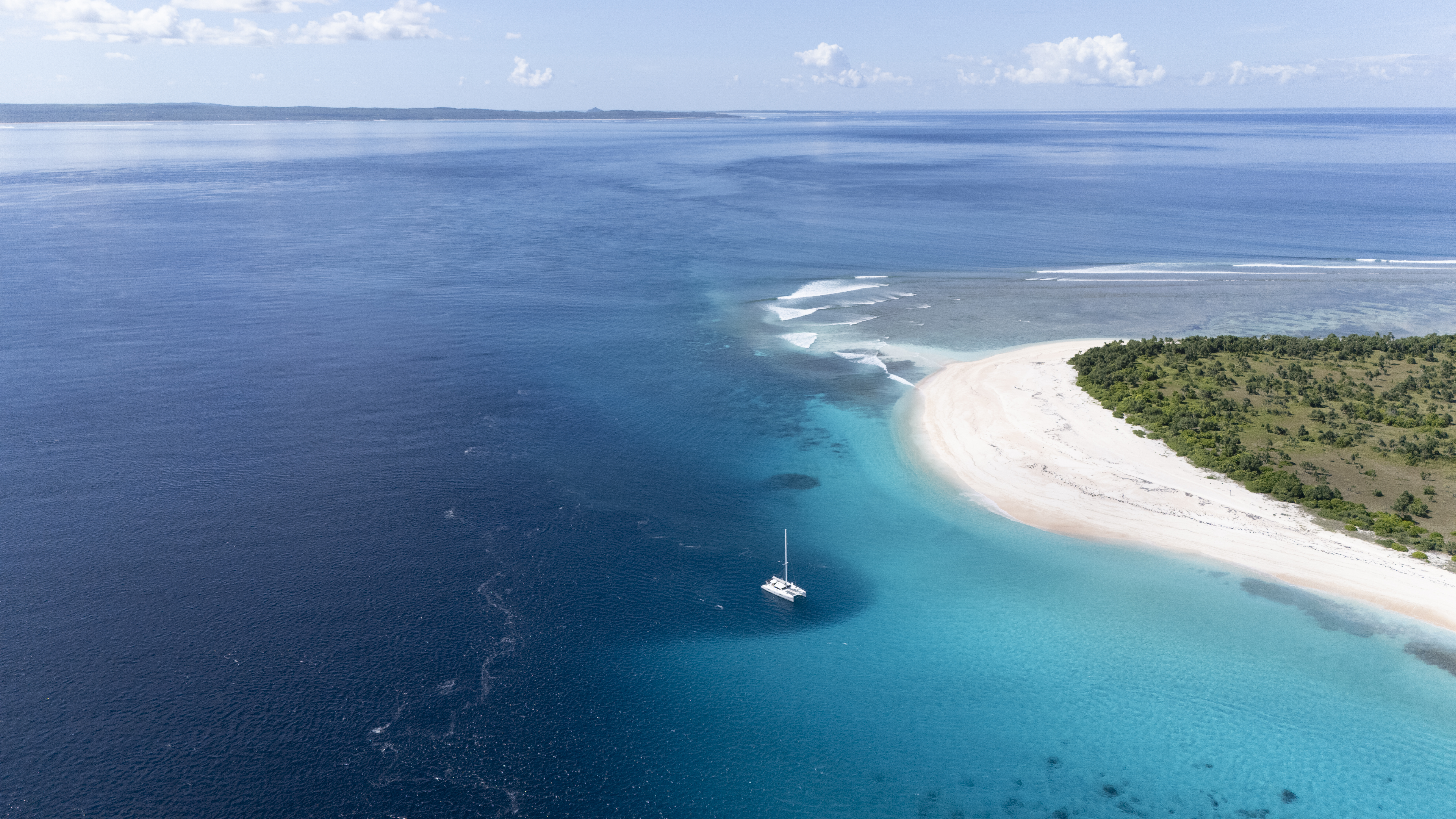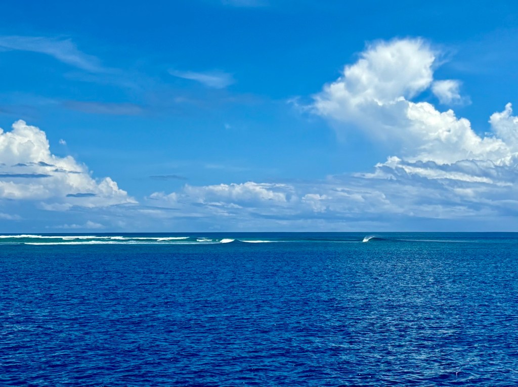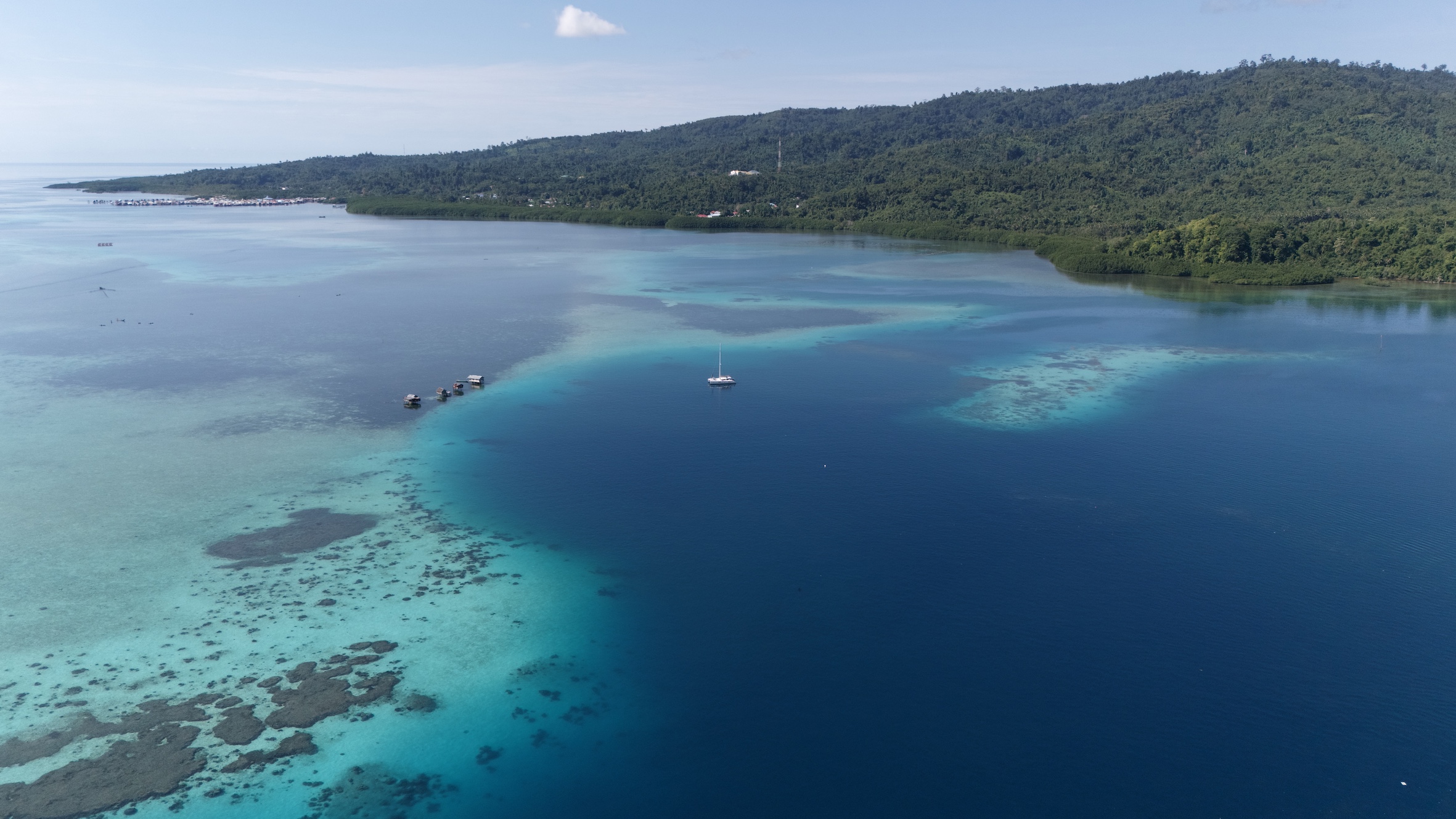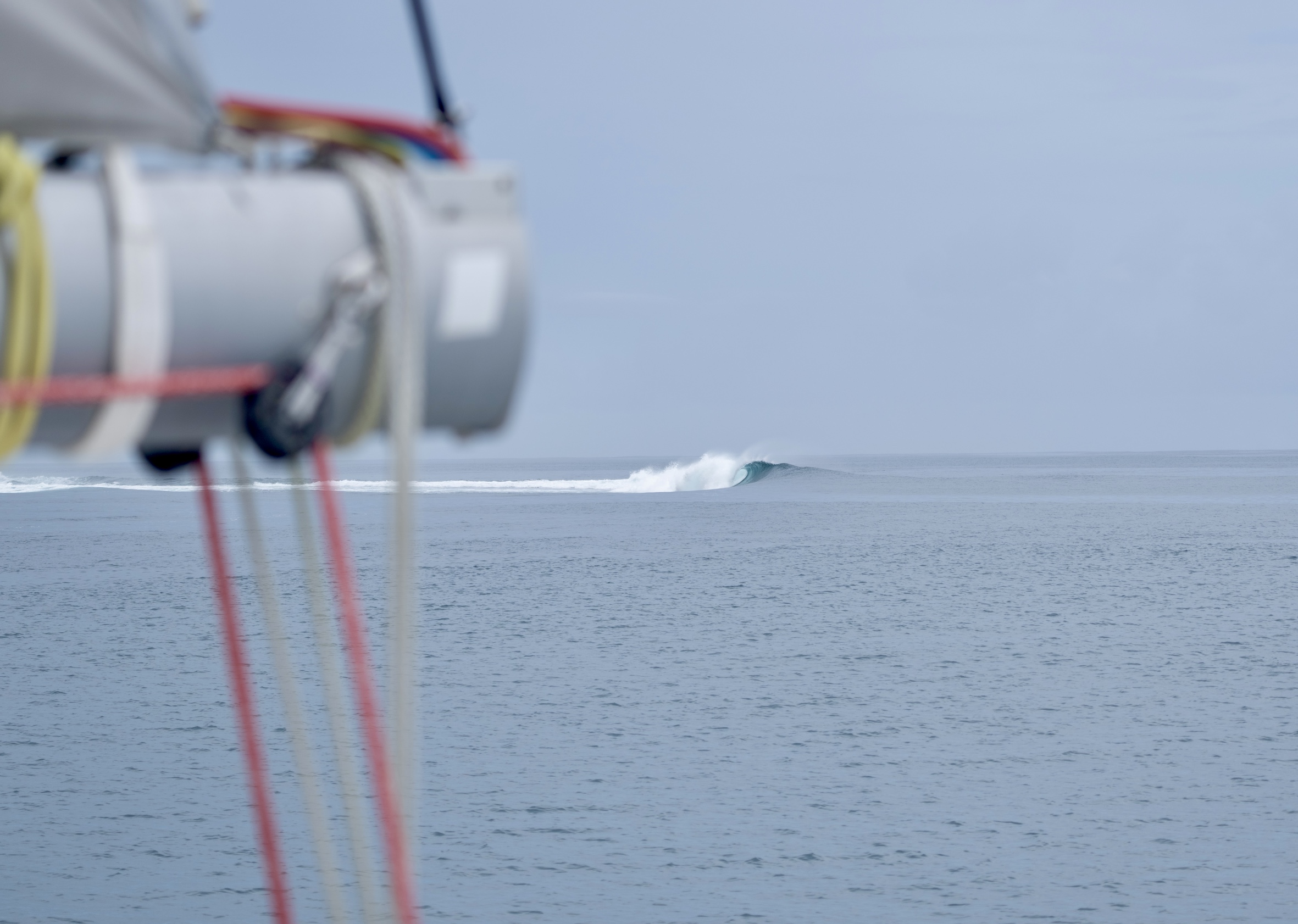 We had noticed this outer reef as we arrived. The swell was standing up over the reef but not breaking, we thought it could be a fun foiling wave. You can just see the lines way beyond the boat in this drone shot, farthest out to sea.