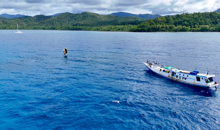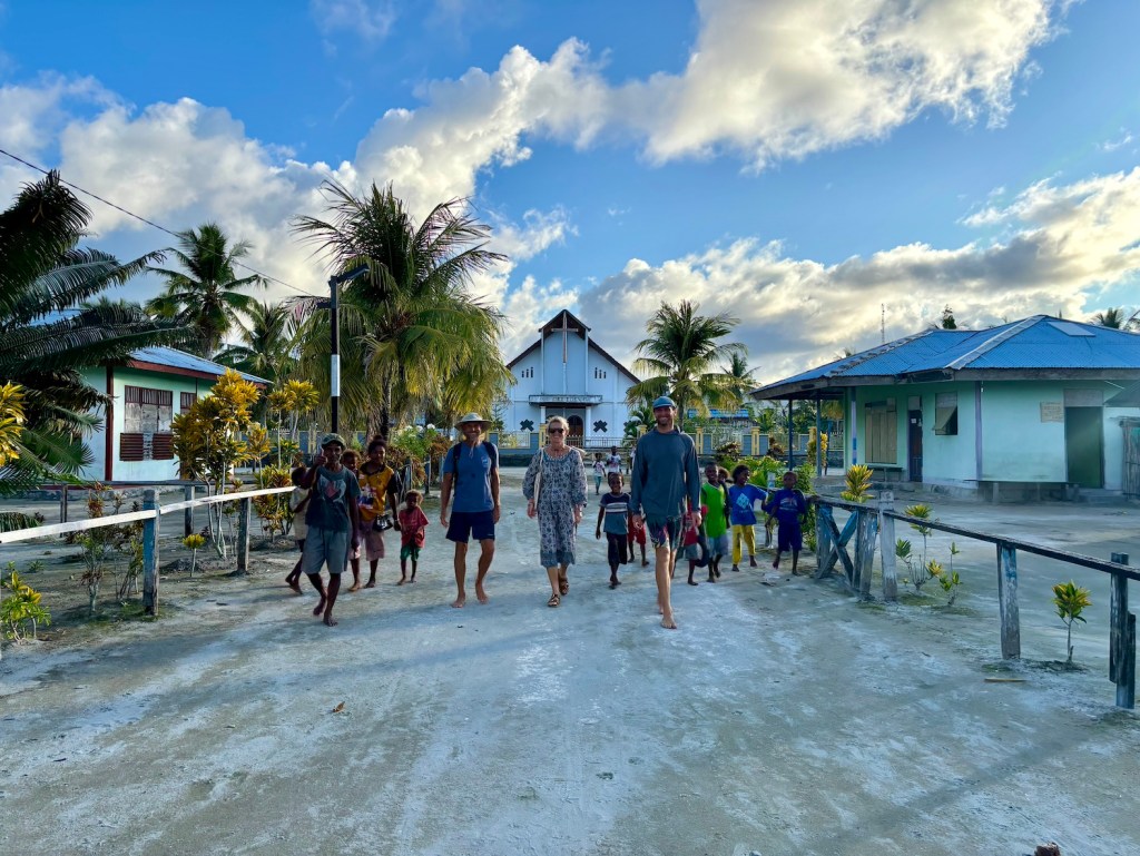 The unfortunate animal was skilfully dispatched and cooked over a fire by the boys at Oeseli, served in the local style. We all shared the feast and toasted our starboard engine.
