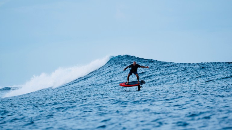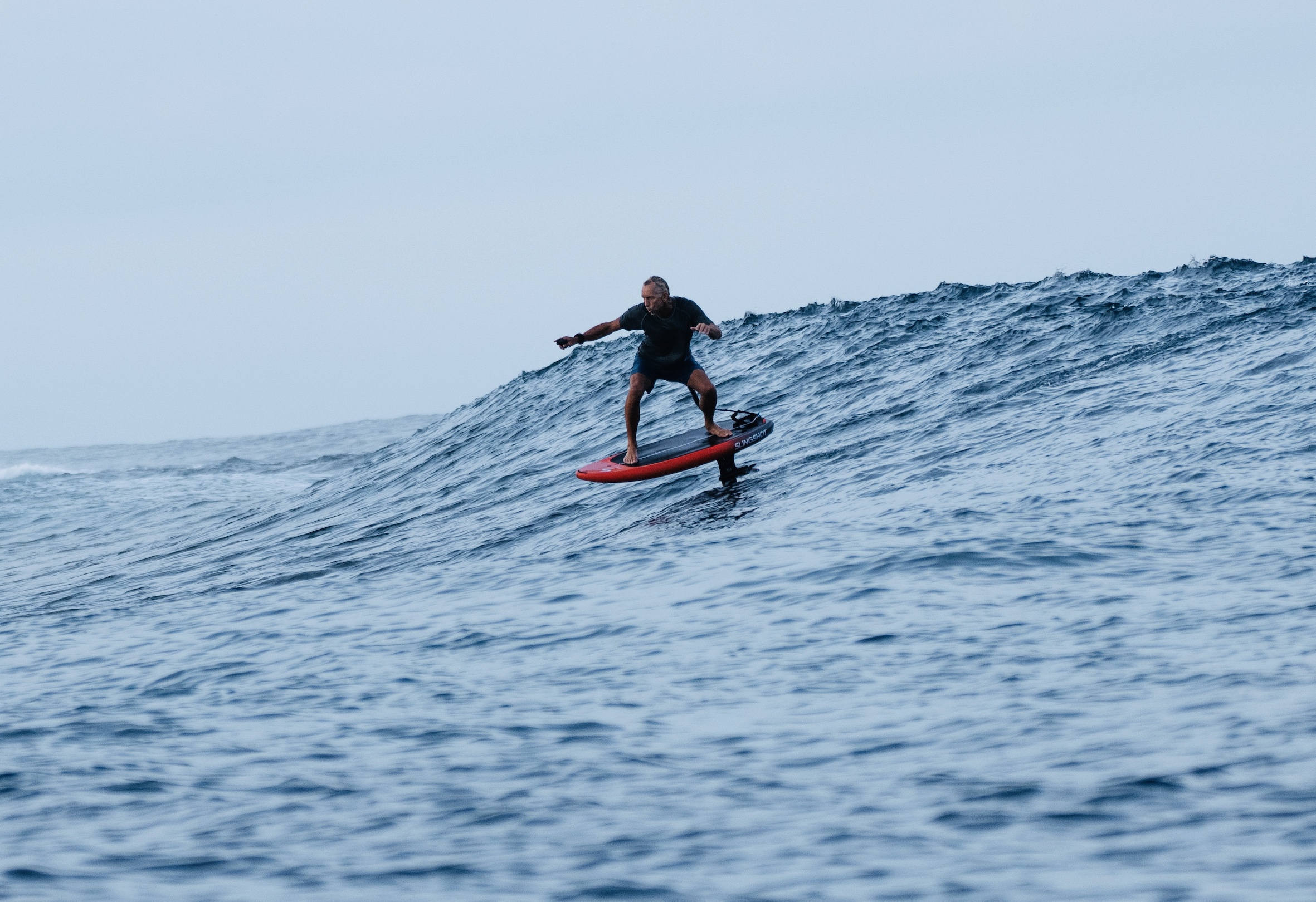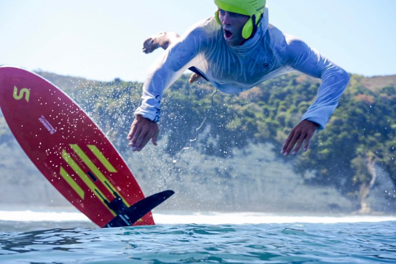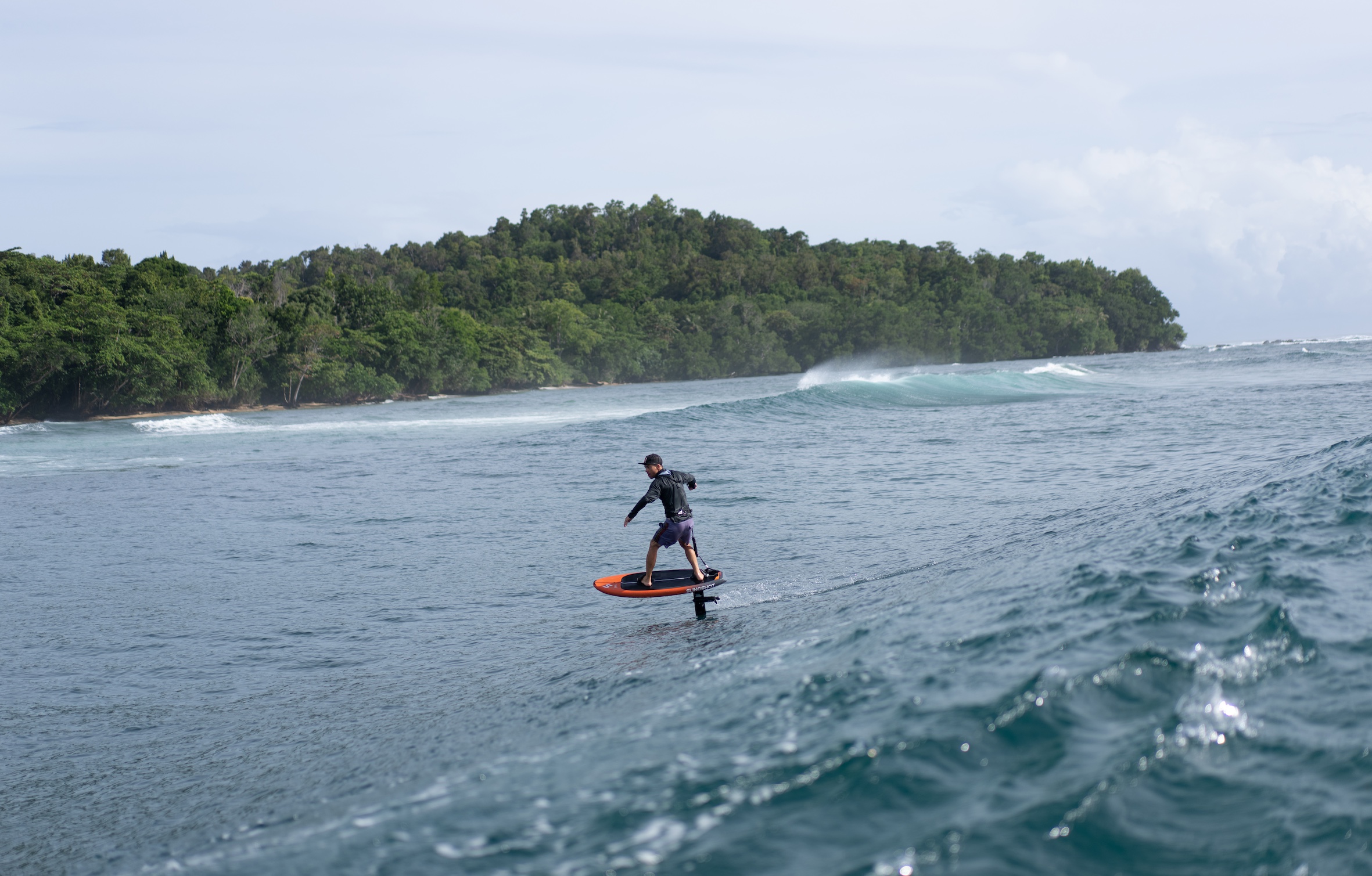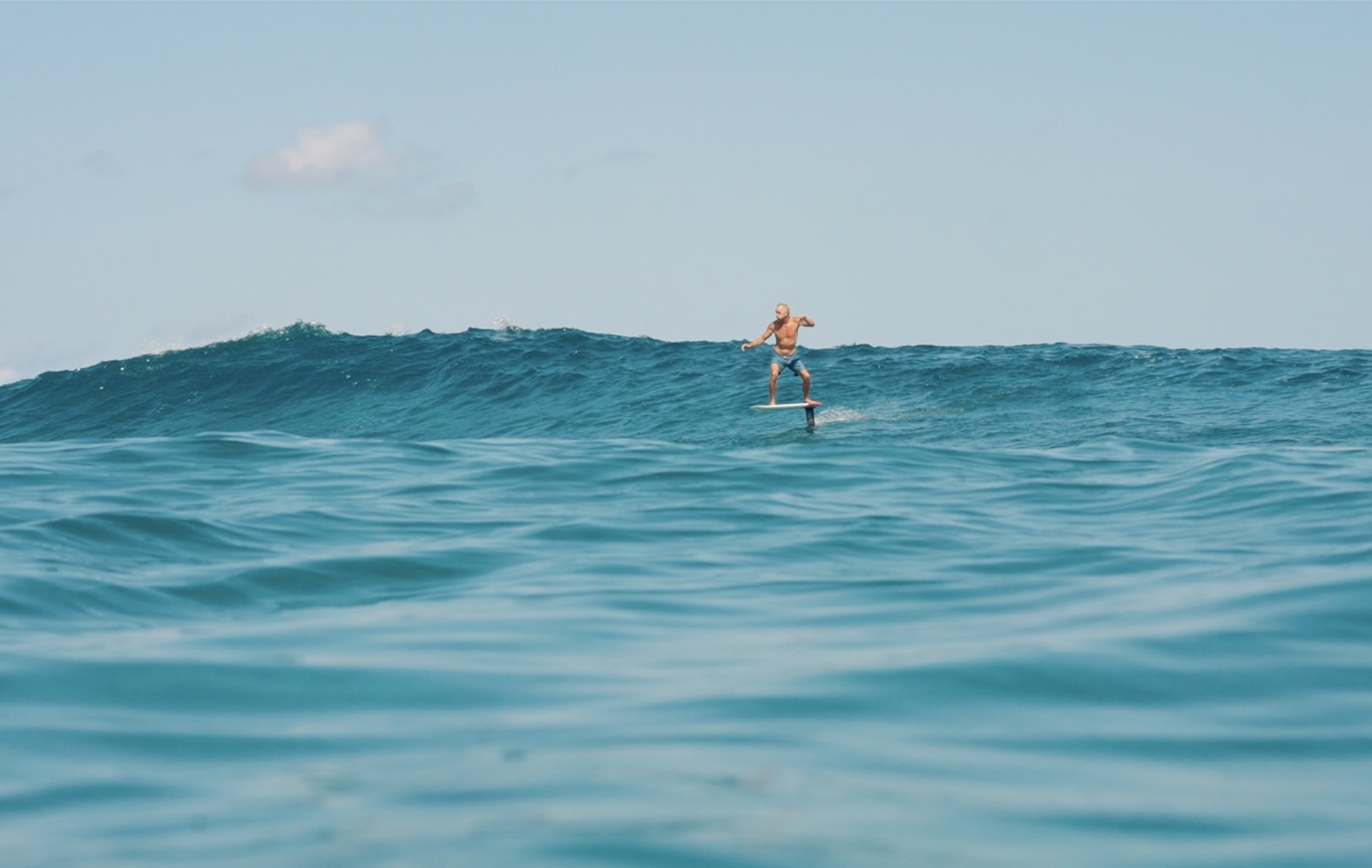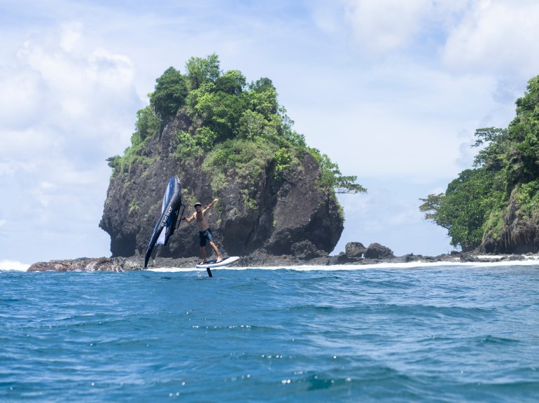 Here’s Bryan between a set and a rocky shore, getting creative with his foil board: