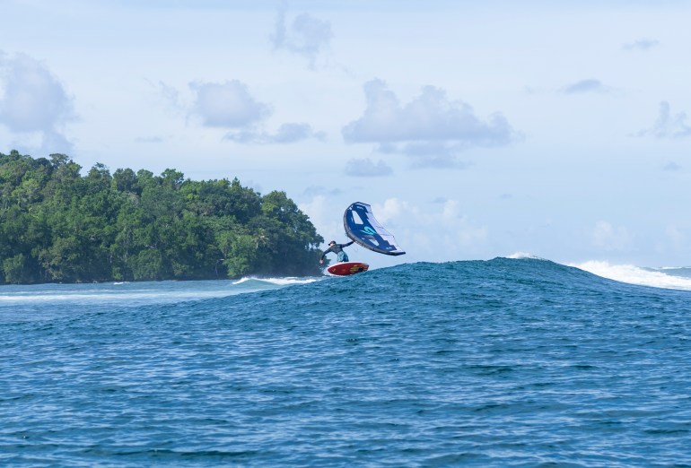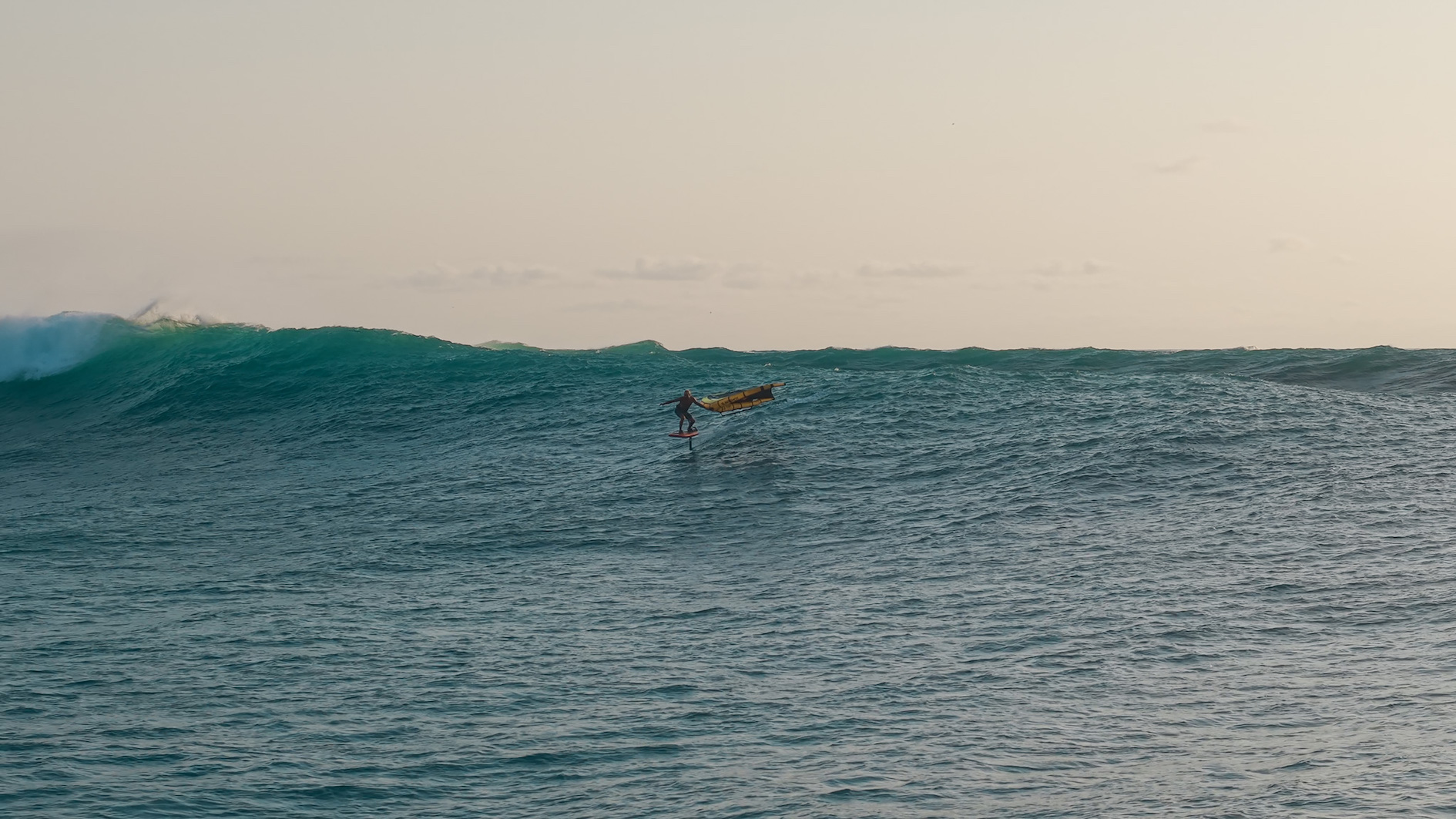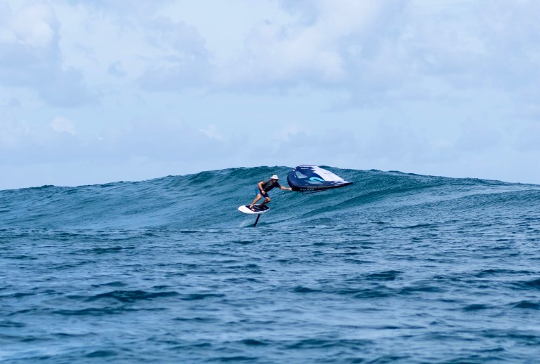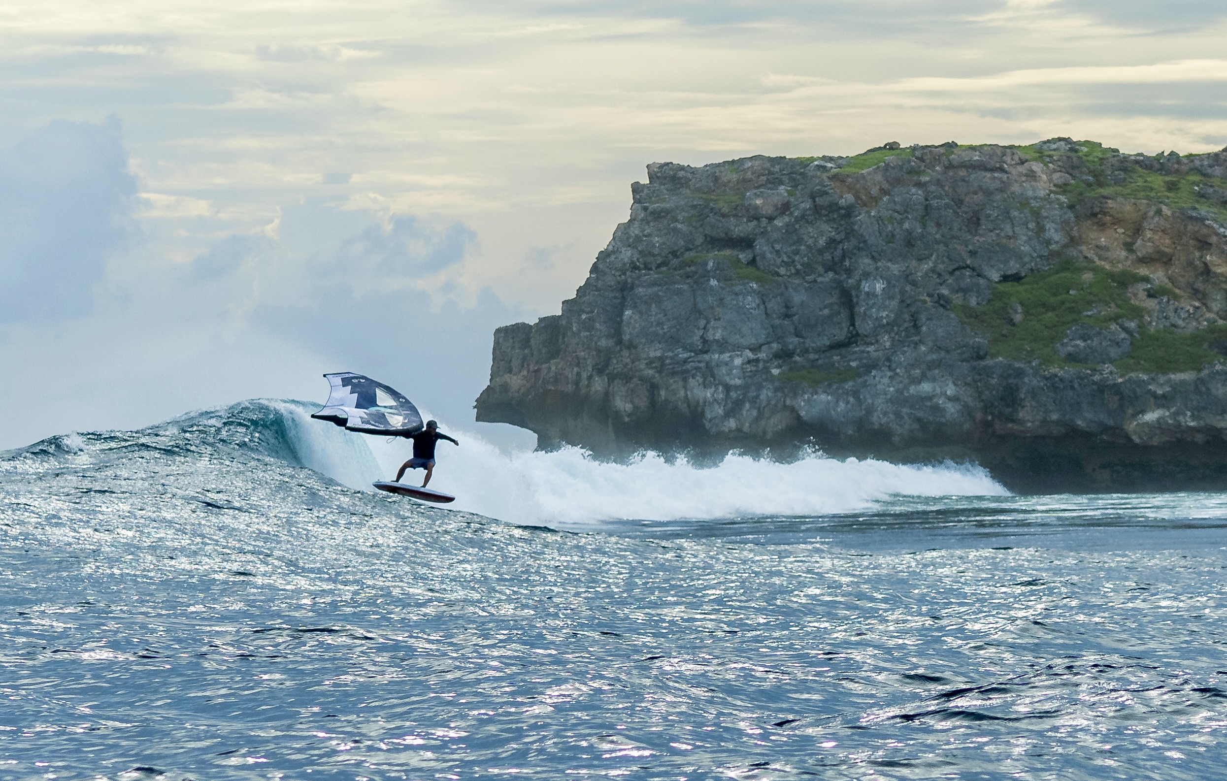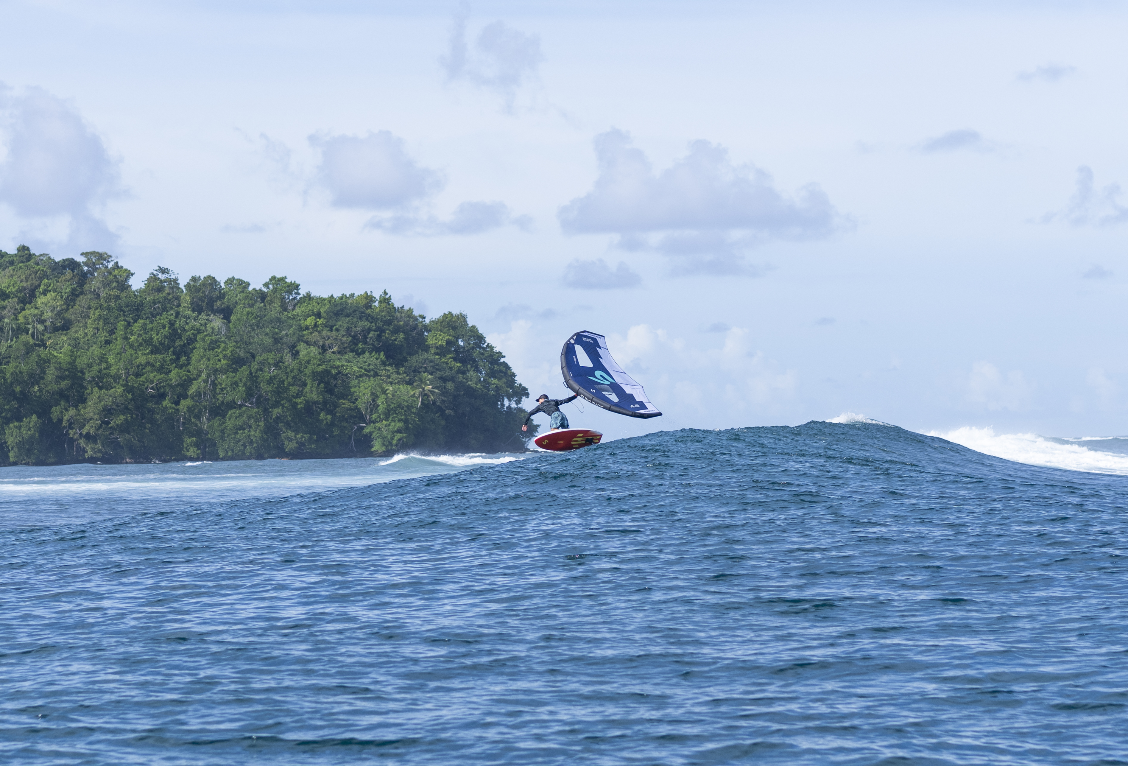 That afternoon, Bryan thought there was just enough wind to wing there. He proved it to us by inflating his 4.5, jumping off a moving Escapade as we motored past, pumping up onto foil and dropping in to a huge set wave.
