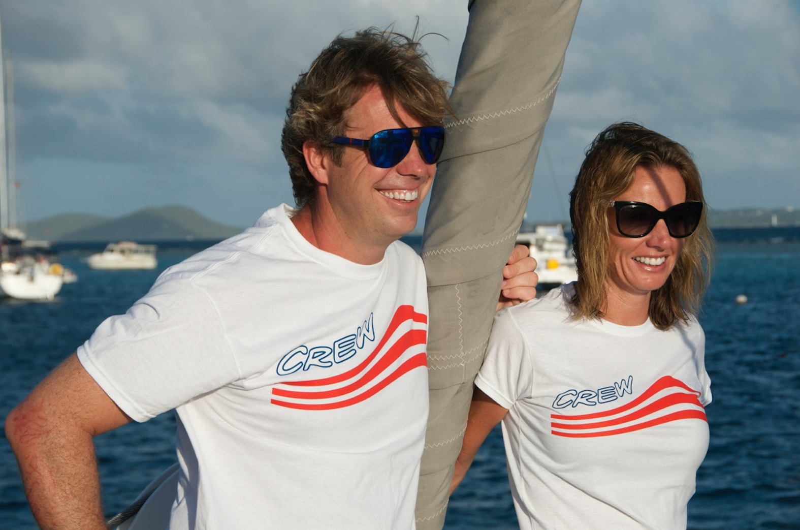 Our first guests on board in the Caribbean. Tony and Gill joined us from Guernsey for a whistle-stop tour of the Virgin Islands, They are now both experienced deck-hands. Tony is a natural helmsman, and very handy with a boat hook. Both our guests graduated from the JP Watersports Centre with new skills in windsurfing and paddleboarding, with Dawn claiming wave of the week at Cane Garden Bay.