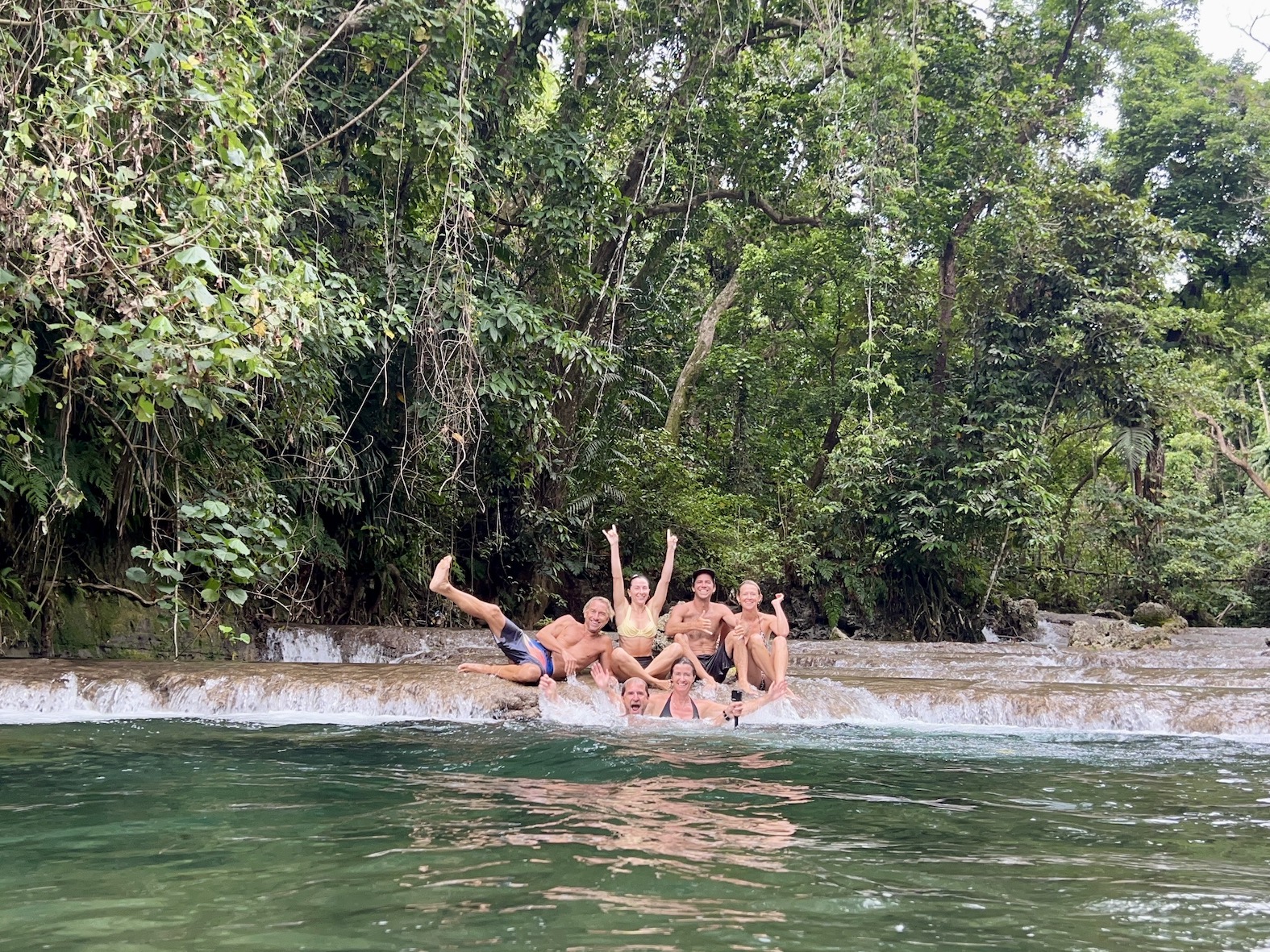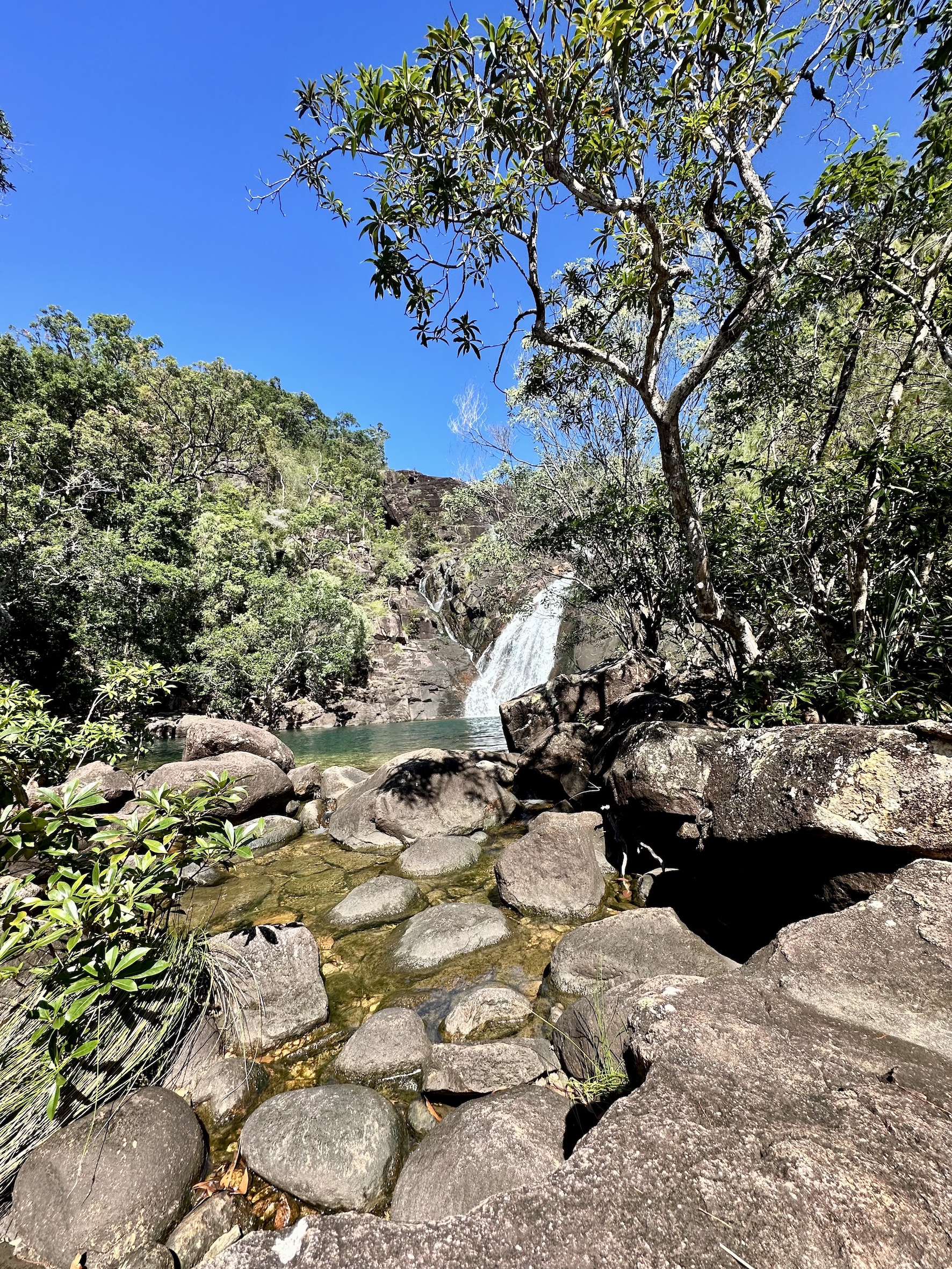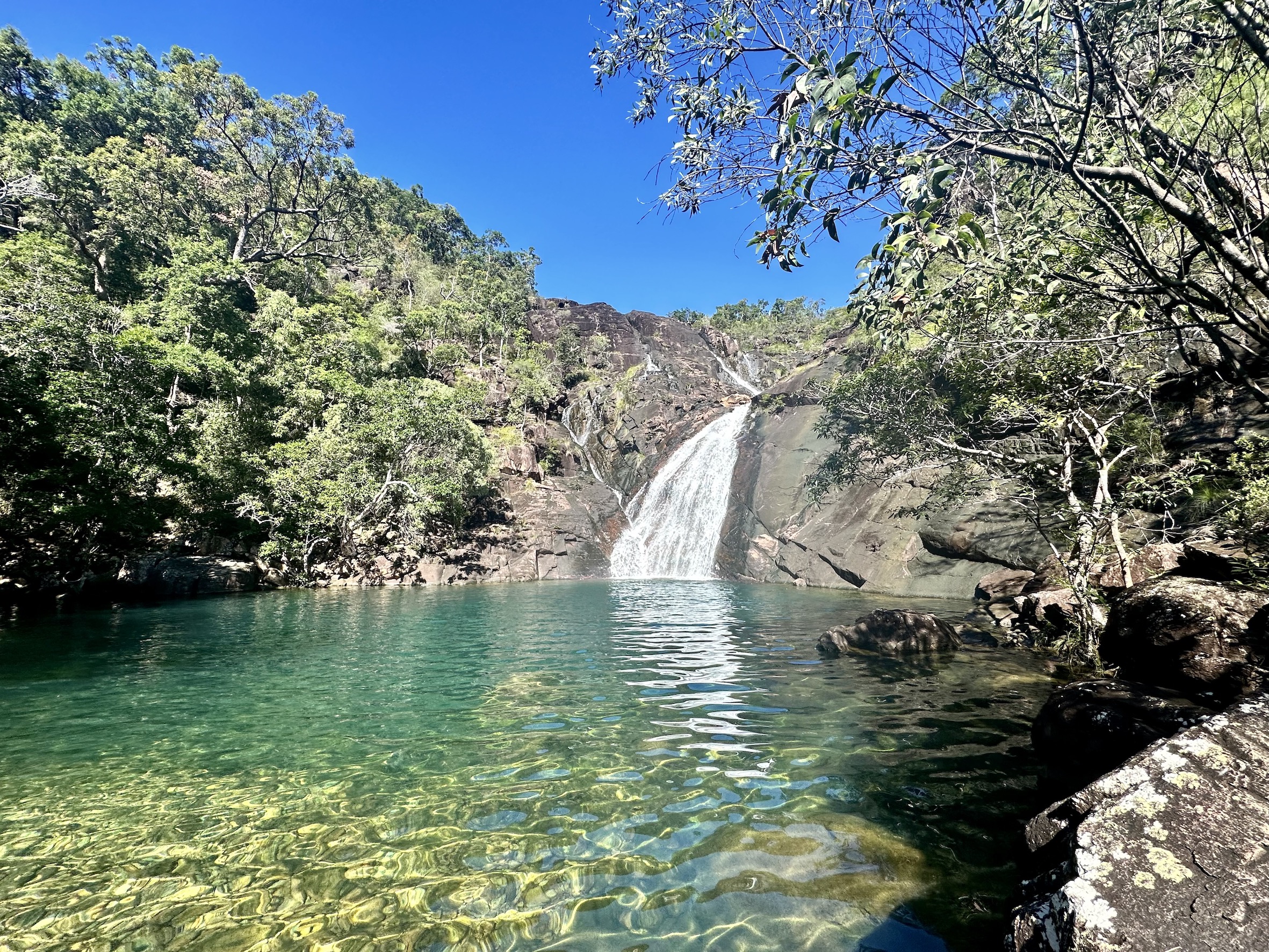 The sun is high now, we clamber down to a pool with clear green water, fed by a cascade above then flooding out across the rock wall, which is the top of the waterfall. Nature’s own hydro-spa infinity pool.
