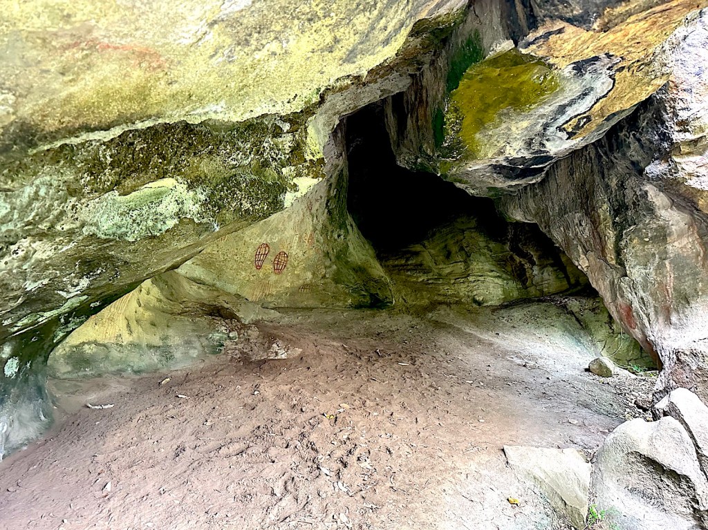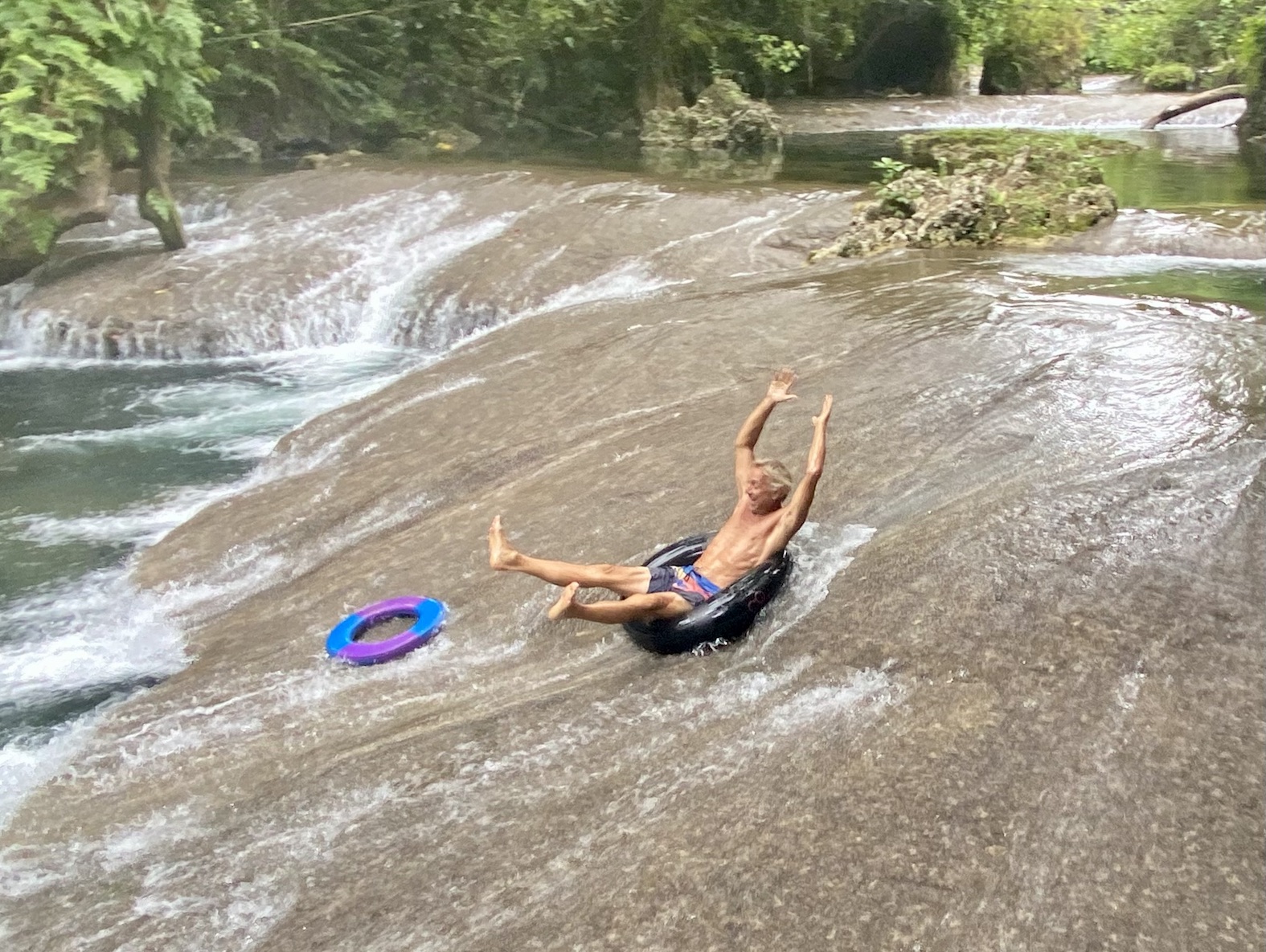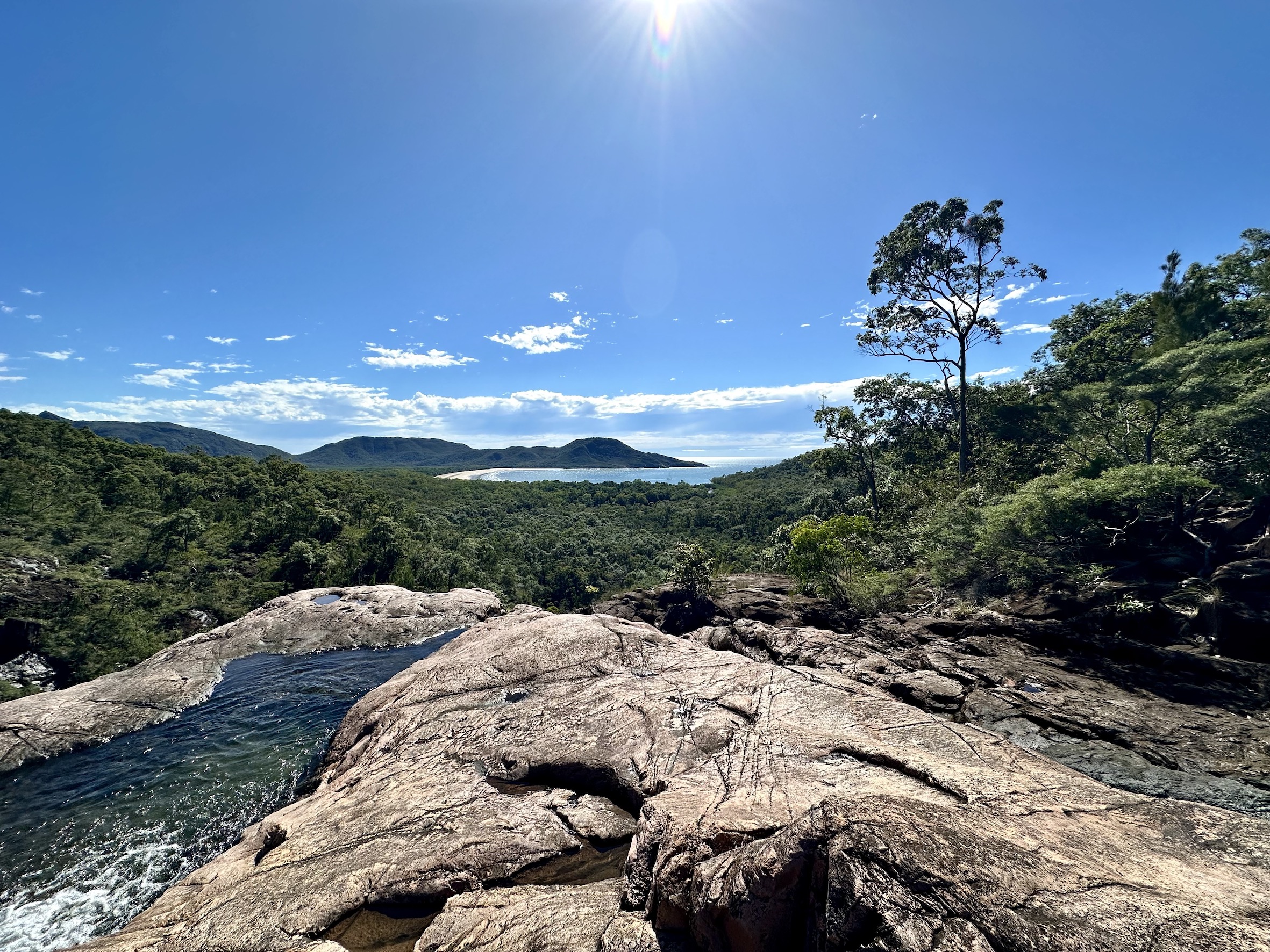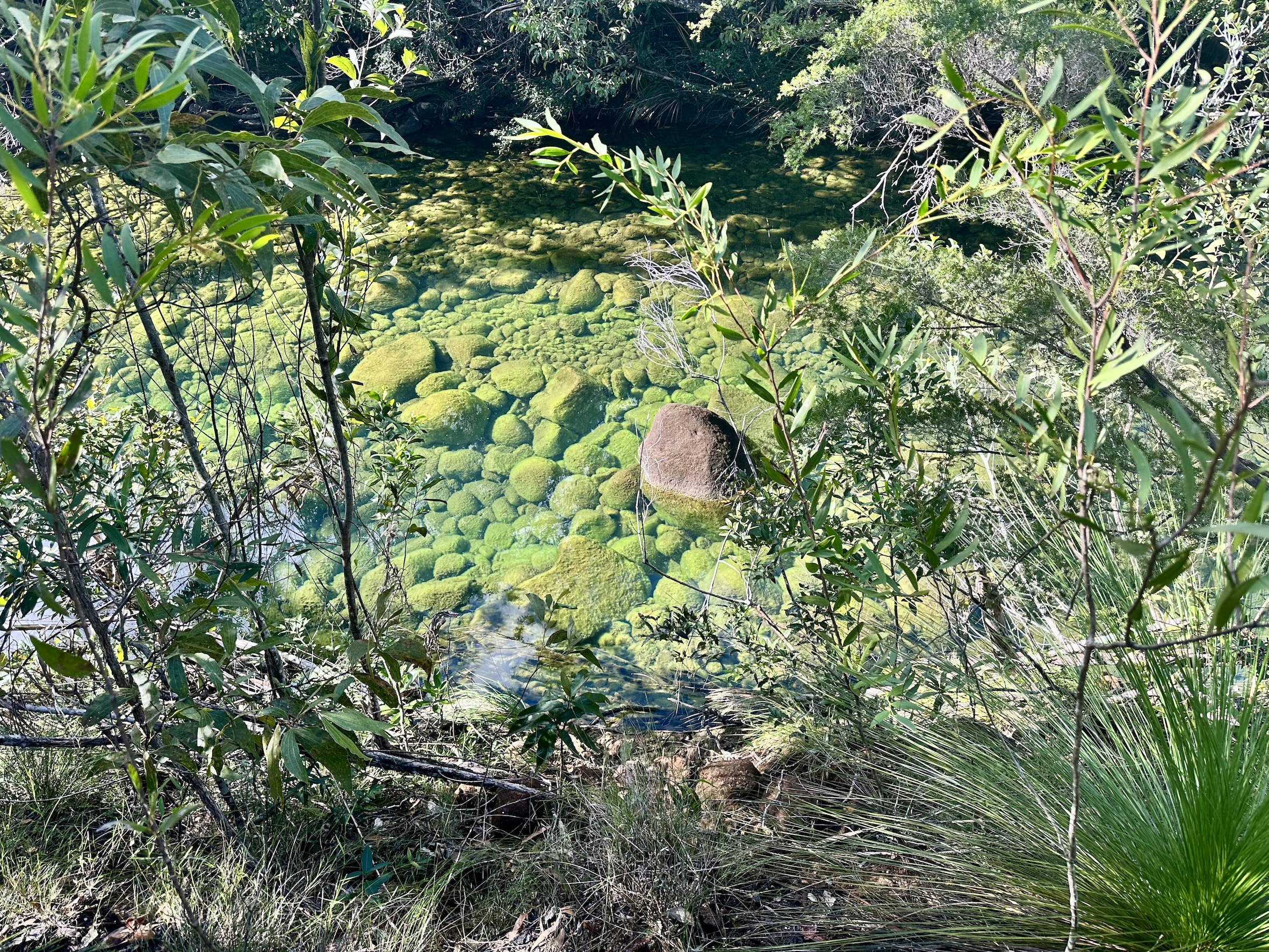 The sun is high now, we clamber down to a pool with clear green water, fed by a cascade above then flooding out across the rock wall, which is the top of the waterfall. Nature’s own hydro-spa infinity pool.
