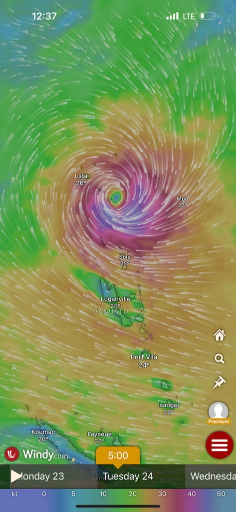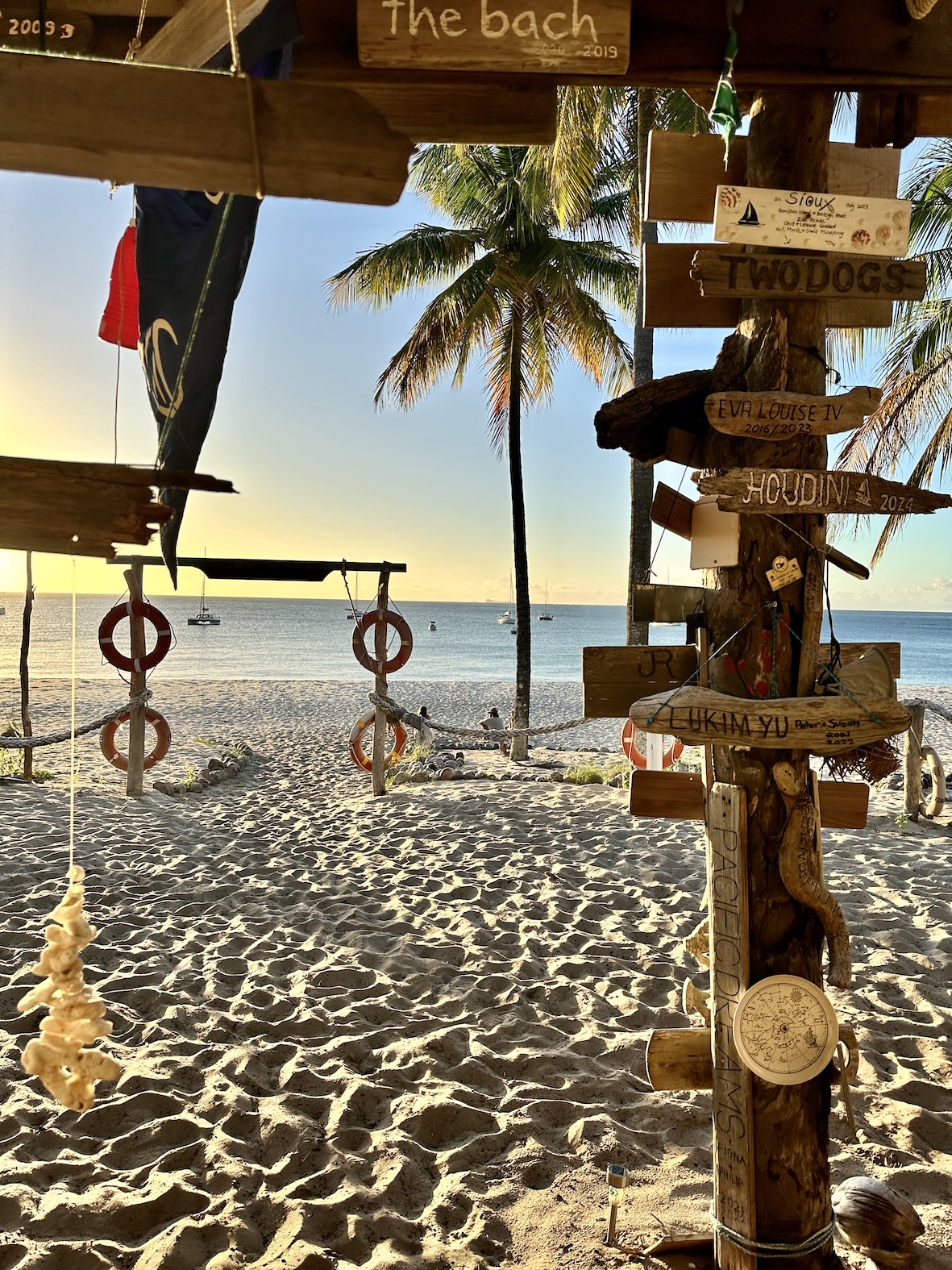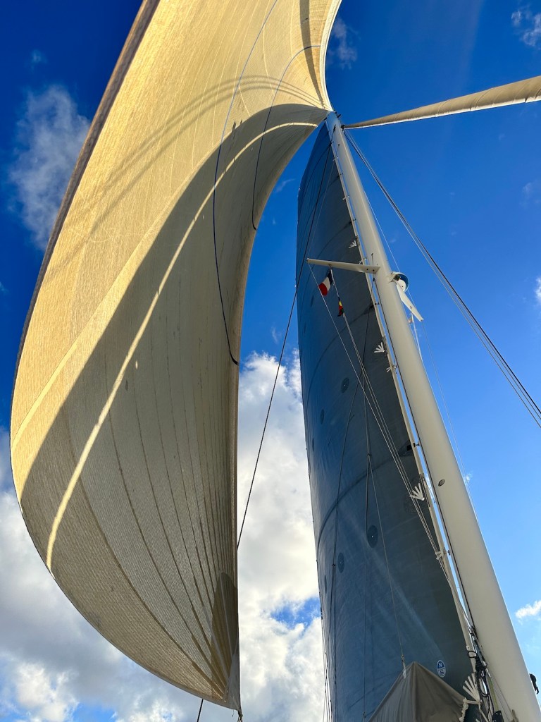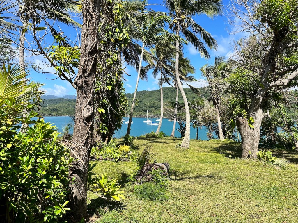Living with the daily routine of forecasts, sailing a few miles, working the tidal streams and researching the next anchorage. With these ‘well developed tradewinds’ that have been blowing most of the time, there is a permanent north-bound wind swell of I metre or more. It’s fine while we’re sailing (downhill) but that swell tends to bend around all the headlands and islands to disturb the peace of most anchorages.