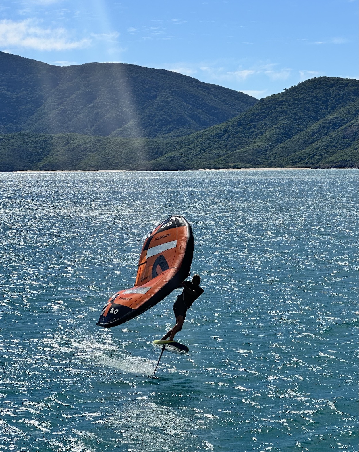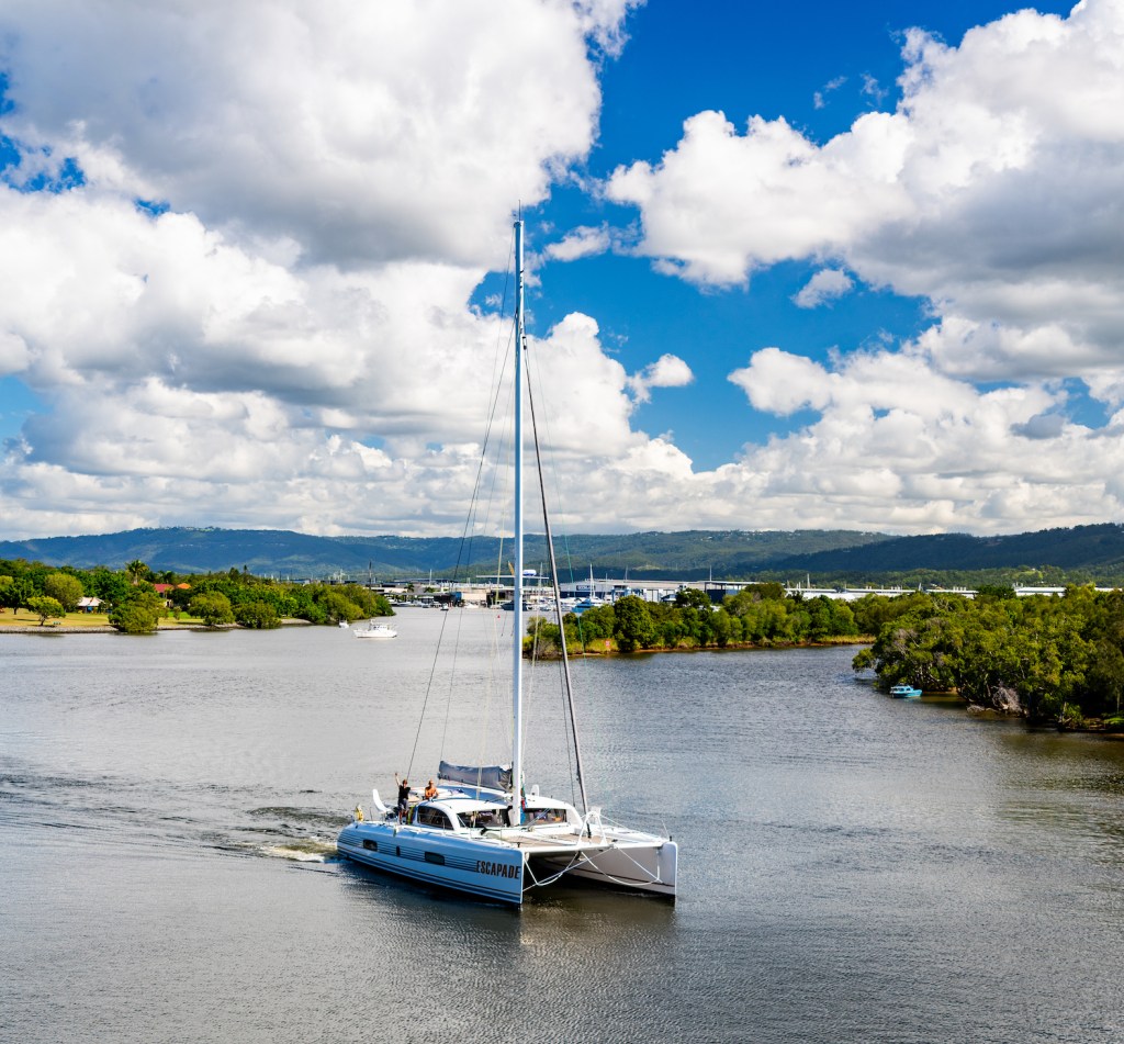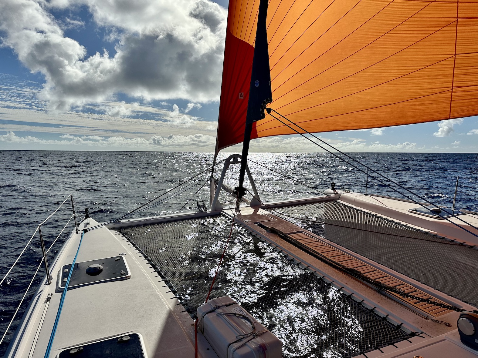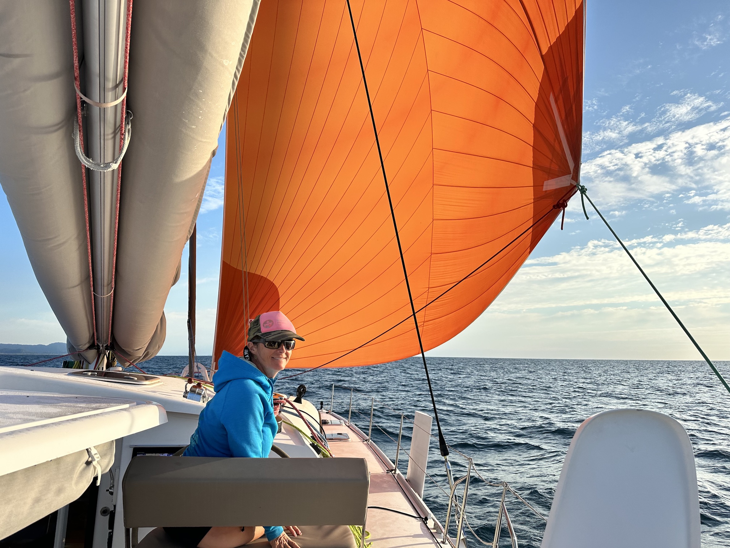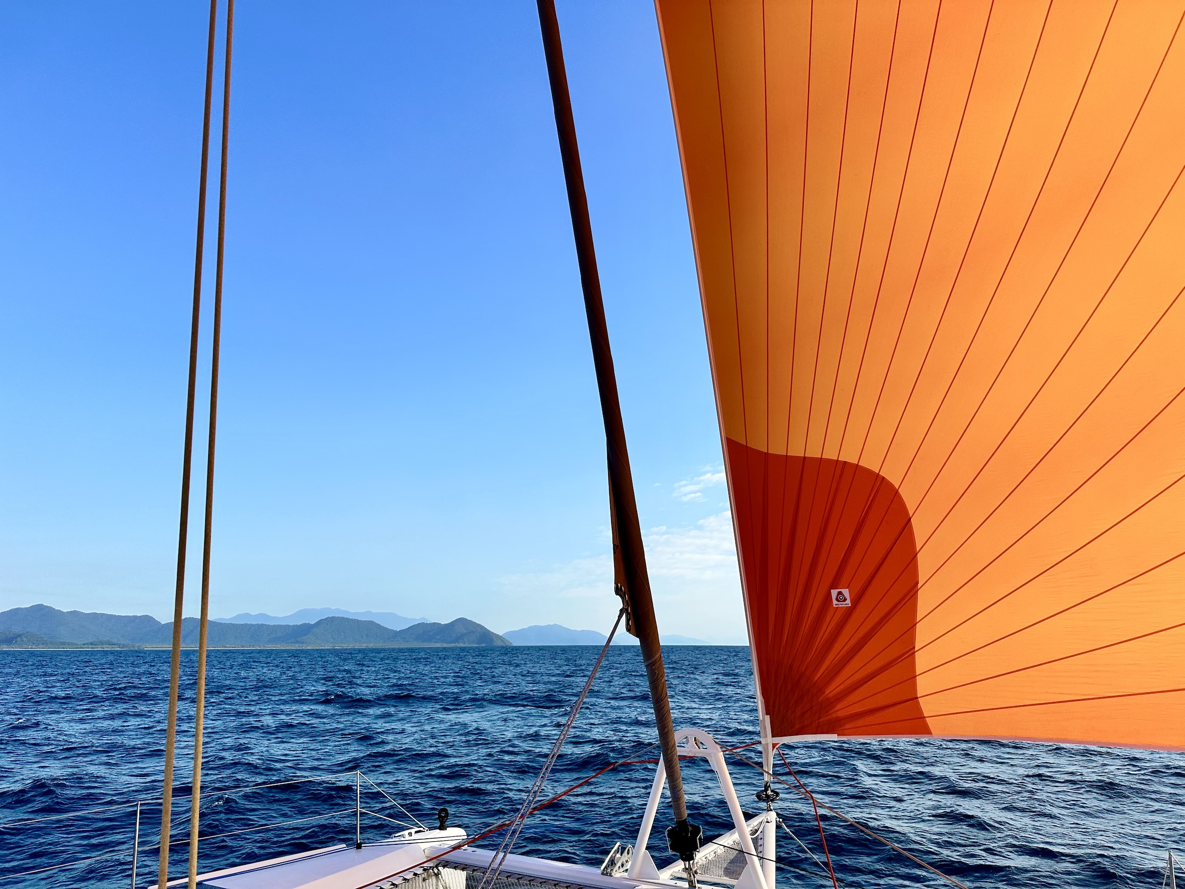 The next day was a corker, gliding along the green mountainous coast under full main and the ‘Big Red’ Code D. We ticked over our 1,000nm from the Gold Coast, and this was our first full day without a reef in the main.