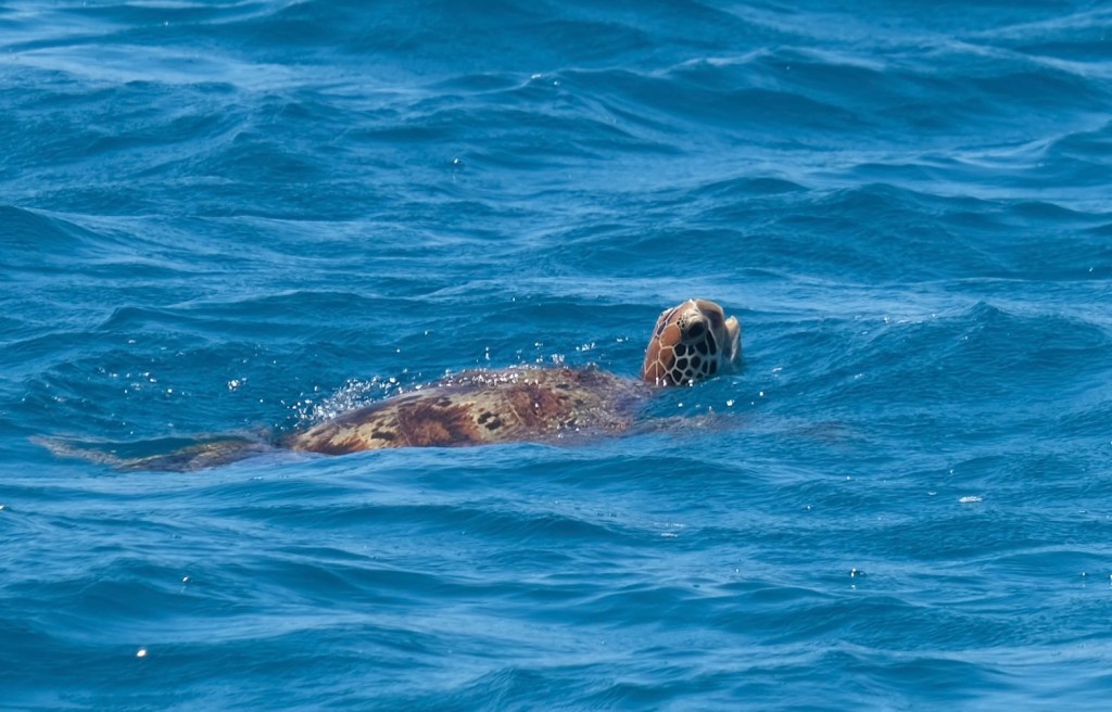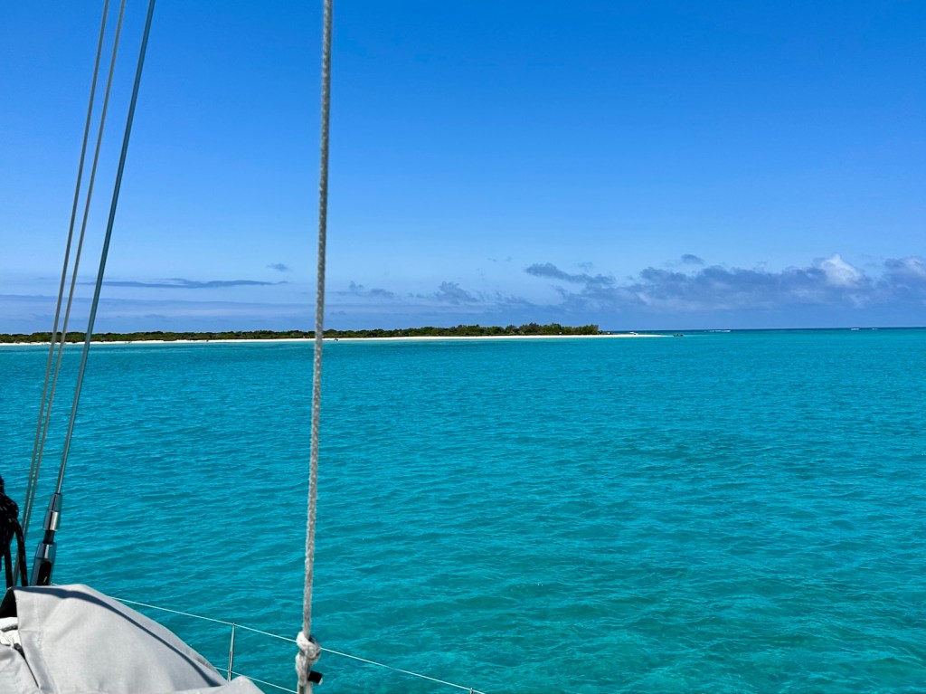 Next morning we motor out at first light. It’s 30 miles to the reef. We arrive between two tiny sand cays, only one of them is charted. To the east of Beaver Cay is another spit of white sand, seems to be home to a few hundred roosting seabirds, masked boobies and some terns. The island is not charted on our plotter or Navionics.