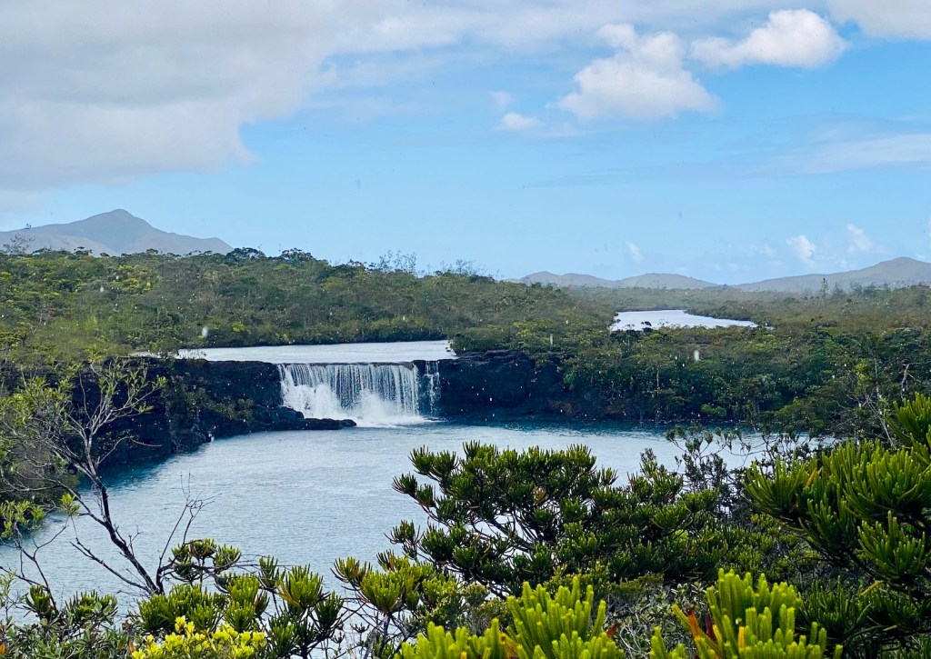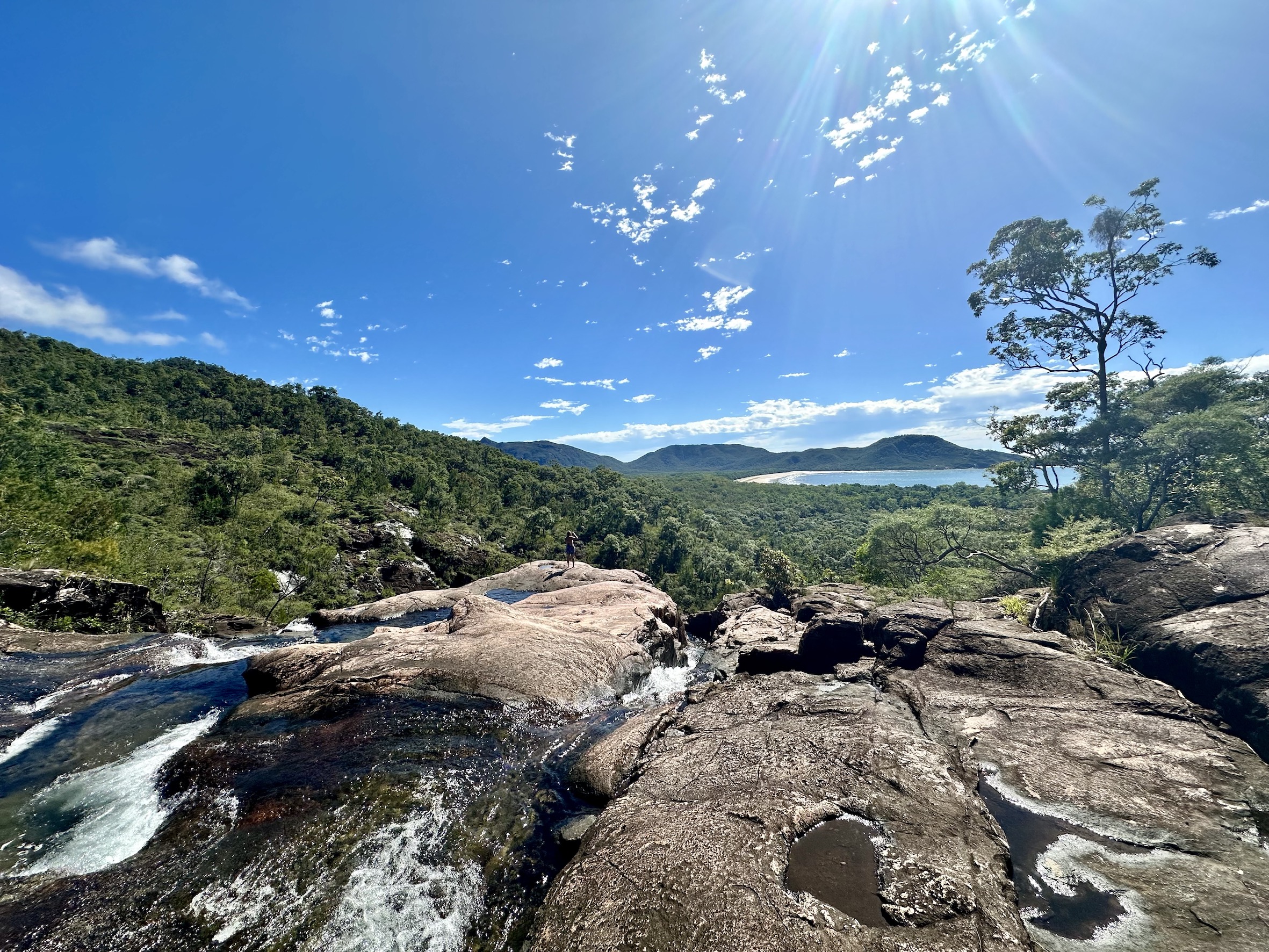 Then up a steeper track to the top of the falls. We emerge from the forest on to a high rock shelf, the water is flowing across the warm stone and down through a series of pools.