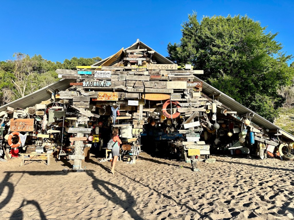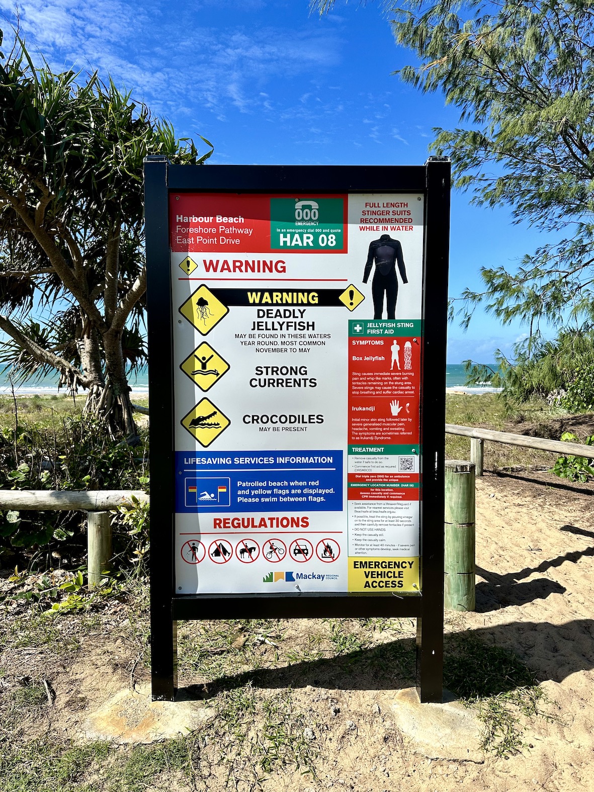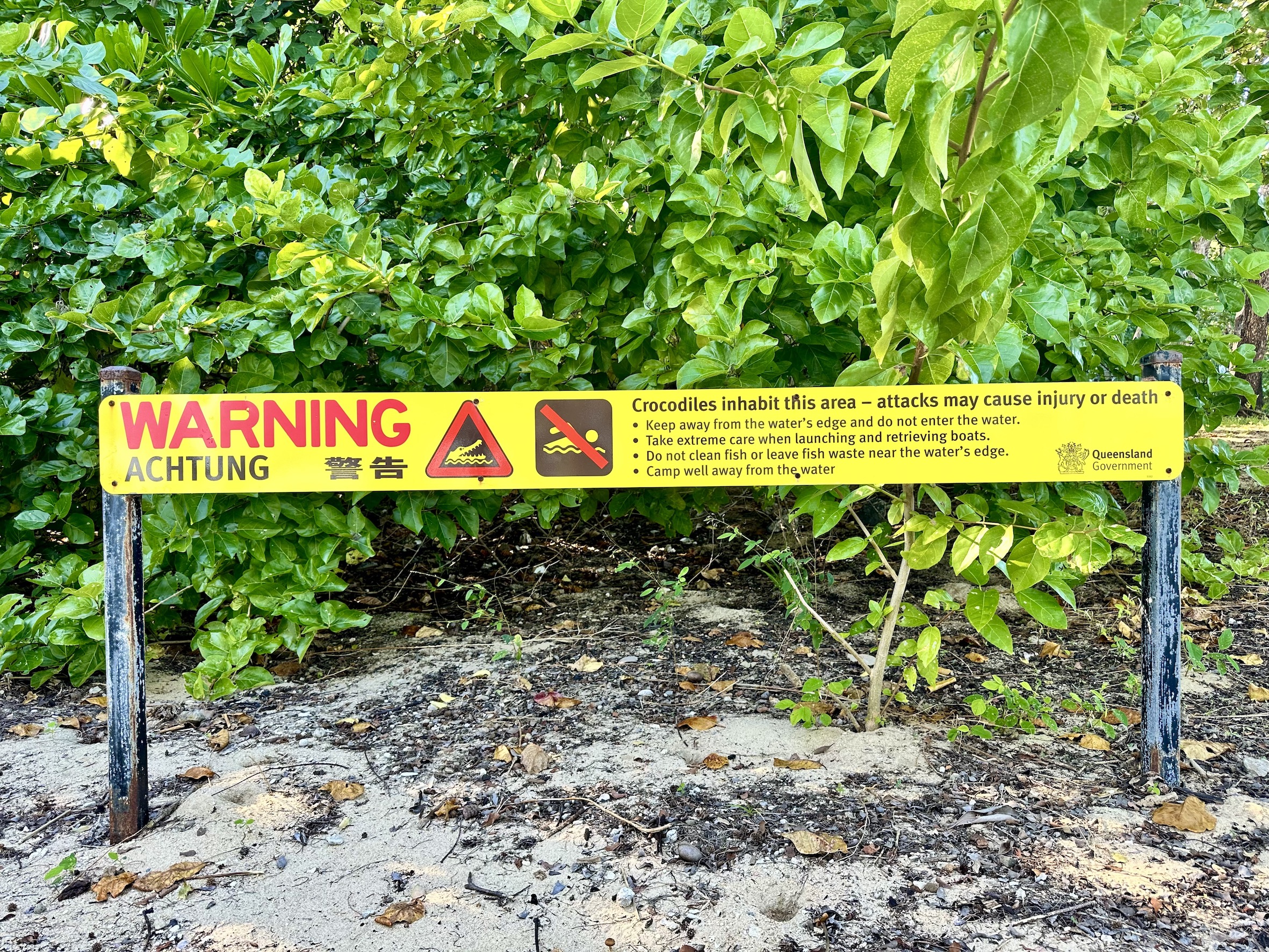 We didn’t see Mr Croc, but he’s there. Maybe he saw us? A bit further along the beach was this welcoming sign.