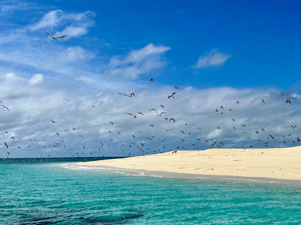 Splendid isolation with our private sandbank and a few hundred masked boobies for company.