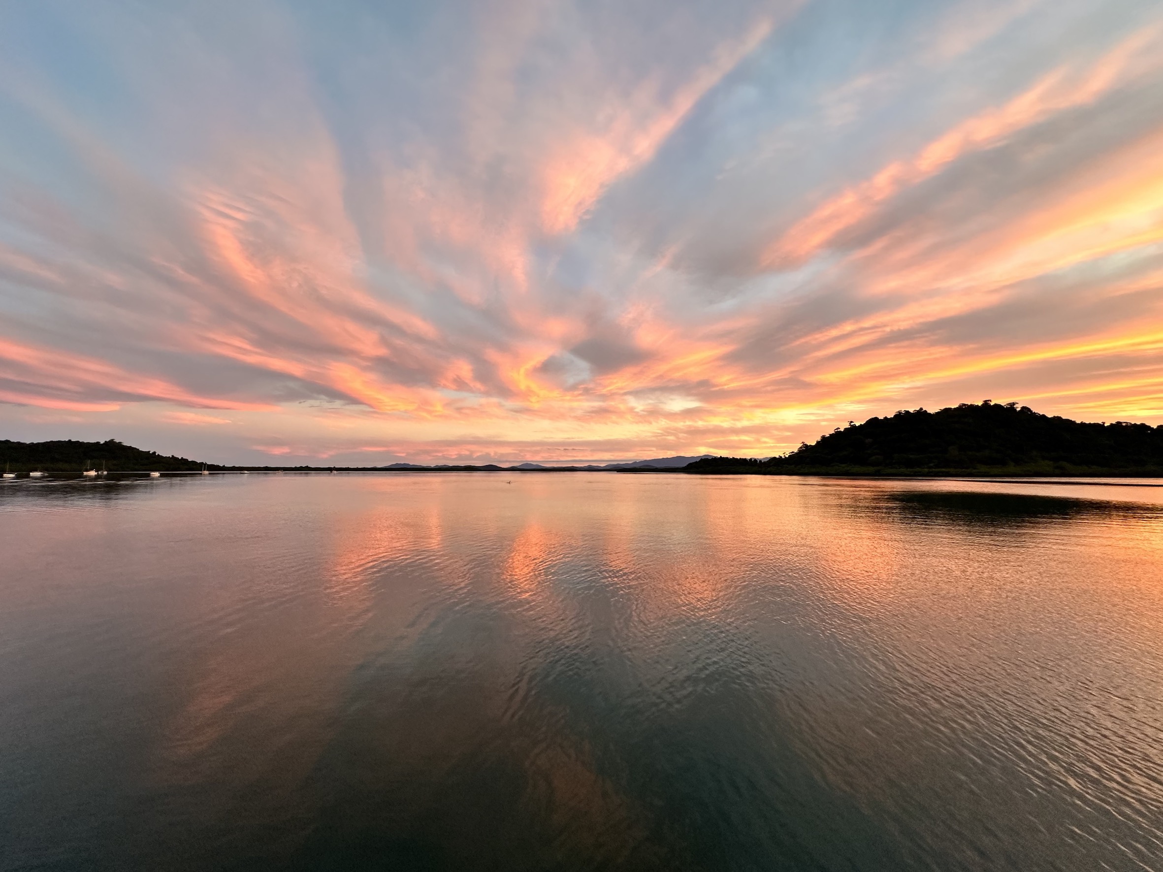 Still heading northwards, but also in towards the mainland in search of a peaceful place to anchor. We found it at Mourilyan Harbour, a working sugar cane port but we checked with the harbour master, no ship movements expected. Blissful calm.